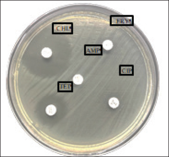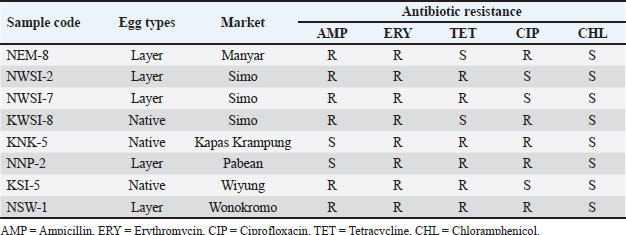 Fig. 2. Multidrug resistant in Salmonella sp. Description: AMP=Ampicillin, ERY = Erythromycin, CIP = Ciprofloxacin, TET = Tetracycline, CHL = Chloramphenicol.
