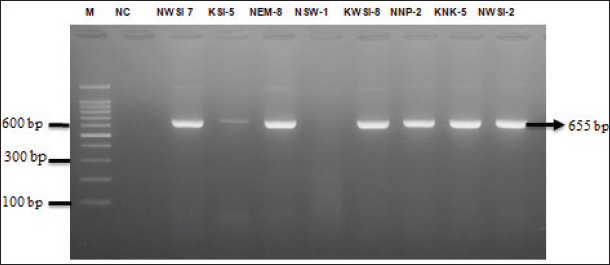 Fig. 3. PCR results of mgtC gene in Salmonella sp. isolates that are MDR. Lane M=DNA marker 100 bp ladder, lane NC=Nuclease free water as a negative control, lane NWSI-7, KSI-5, NEM-8, KWSI-8, NNP-2, KNK-5, NWSI-2. positive result of mgtC gene and NSW-8 negative result of mgtC gene. Antibiotics that continue to experience resistance will trigger the emergence of MDR, in which bacteria experience resistance to three or more different antibiotic classes (Khairullah et al., 2019; Ramandinianto et al., 2020; Widodo et al., 2022). A total of 8 Salmonella sp. isolates in this study showed multidrug-resistant (MDR) properties of 29.62% (8/27). Other studies were reported by Soria et al. (2024) in egg samples from Argentina that experienced MDR against Salmonella sp. by 87%. The occurrence of resistance can vary in different regions. These differences may be attributable to variations in the environment and the level of antibiotic use in those areas (Tao et al., 2017). The routine use of broad-spectrum antibiotics is also a factor contributing to changes in resistance patterns to various types of antibiotics (Khairullah et al., 2024). Antibiotic sensitivity tests showed that Salmonella sp. isolates from eggshell swabs from traditional markets in Surabaya had a MDR pattern with various antibiotic combinations. Bacterial resistance patterns can vary in each region due to differences in the environment and levels of antibiotic use (Tao et al., 2017). The routine use of broad-spectrum antibiotics also contributes to changes in resistance patterns (Khairullah et al., 2023). PCR test showed that the mgtC gene was detected in seven of eight isolates that were considered MDR (87.5%). Previous studies reported that the mgtC gene was detected in Salmonella sp. isolates at a percentage of 100% (27 / 27) (Andesfha et al., 2019). The presence of the mgtC gene in Salmonella sp., which is multidrug resistant, poses a serious threat to global public health. The ability of this bacteria to evade the immune system and confer resistance to various classes of antibiotics increases the risk of spreading infections to humans and animals (Billah and Rahman, 2024). This condition contributes to the increased incidence of diseases caused by Salmonella sp. ConclusionThis study found Salmonella sp. in 27 of 160 isolates (16.87%) of chicken eggshells in Surabaya Traditional Market, with eight isolates (29.62%) being MDR. The mgtC gene was detected in seven of eight MDR isolates (87.5%). Increasing public awareness of food safety and farmers’ understanding of Salmonellosis is very important. Prevention and control of multidrug resistance can be achieved through the wise use of antibiotics. This study provides descriptive insights into the phenomenon observed in the sample but does not use statistical analysis to test the significance of differences or relationships between variables. Therefore, the results should be considered as useful preliminary findings. However, it is important to note that generalizing these findings to a broader population requires further research with a more in-depth statistical approach. AcknowledgmentsThe authors would like to thank the Universitas Airlangga. Conflict of interestThe authors declare no conflict of interest. FundingThis study was partly supported by The International Research Consortium, Lembaga Penelitian dan Pengabdian Masyarakat, Universitas Airlangga, Surabaya, Indonesia in the year 2024 with grant number: 171/UN3.LPPM/PT.01.03/2024. Author’s contributionsLRS, AAS, and ARK: Conceived, designed, and coordinated the study. WT, PK, and MHE: Designed data collection tools, supervised the field sample and data collection, and laboratory work as well as data entry. KHPR, IBM, and SR: Validation, supervision, and formal analysis. AW, SMY, and BB: Contributed reagents, materials, and analysis tools. DAA and RZA: Statistical analysis and interpretation and preparation of the manuscript. All authors have read, reviewed, and approved the final manuscript. Data availabilityAll data are available in the manuscript. ReferencesAbo-Al-Ela, H.G., El-Kassas, S., El-Naggar, K., Abdo, S.E., Jahejo, A.R. and Al Wakeel, R.A. 2021. Stress and immunity in poultry: light management and nanotechnology as effective immune enhancers to fight stress. Cell Stress Chaperones 26(3), 457–472. Alegbeleye, O.O., Singleton, I. and Sant’Ana, A.S. 2018. Sources and contamination routes of microbial pathogens to fresh produce during field cultivation: A review. Food Microbiol. 73(1), 177–208. Andesfha, E., Indrawati, A., Mayasari, N.L.P.I., Rahayuningtyas, I. and Jusa, I. 2019. Detection of Salmonella pathogenicity island and Salmonella plasmid virulence genes in Salmonella Enteritidis originated from layer and broiler farms in Java Island. J. Adv. Vet. Anim. Res. 6(3), 384–393 Archer, E.W., Chisnall, T., Tano-Debrah, K., Card, R.M., Duodu, S. and Kunadu, A.P. 2023. Prevalence and genomic characterization of Salmonella isolates from commercial chicken eggs retailed in traditional markets in Ghana. Front. Microbiol. 14(1), 1283835. Billah, M.M. and Rahman, M.D.S. 2024. Salmonella in the environment: a review on ecology, antimicrobial resistance, seafood contaminations, and human health implications. J. Hazard Mater. Adv. 13(1), 100407. Castro-Vargas, R.E., Herrera-Sánchez, M.P., Rodríguez-Hernández, R. and Rondón-Barragán, I.S. 2020. Antibiotic resistance in Salmonella spp. isolated from poultry: a global overview. Vet. World 13(10), 2070–2084. Choi, S., Choi, E., Cho, Y.J., Nam, D., Lee, J. and Lee, E.J. 2019. The Salmonella virulence protein MgtC promotes phosphate uptake inside macrophages. Nat. Commun. 10(1), 3326. Chopra, I. and Roberts, M. 2001. Tetracycline antibiotics: mode of action, applications, molecular biology, and epidemiology of bacterial resistance. Microbiol. Mol. Biol. Rev. 65(2), 232–260. CLSI (Clinical and Laboratory Standards Institute). 2023. Performance standards for antim