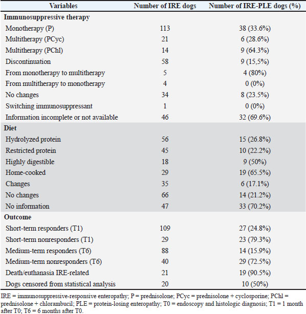 Methods: Of the 148 dogs, 53 were classified as having presumptive inflammatory protein-losing enteropathy (IRE-PLE). The factors associated with treatment failure were also analyzed. Clinical severity (CCECAI), serum albumin concentration, type of immunosuppressive therapy (prednisolone vs prednisolone in combination with cyclosporine or chlorambucil), type of diet (hydrolyzed protein, restricted antigen, highly digestible, restricted fat), and cobalamin supplementation were evaluated at diagnosis (T0) and after 1 (T1) and 6 (T6) months. CCECAI at T1 and T6 were used to evaluate the short- and medium-term response, respectively.