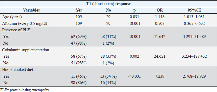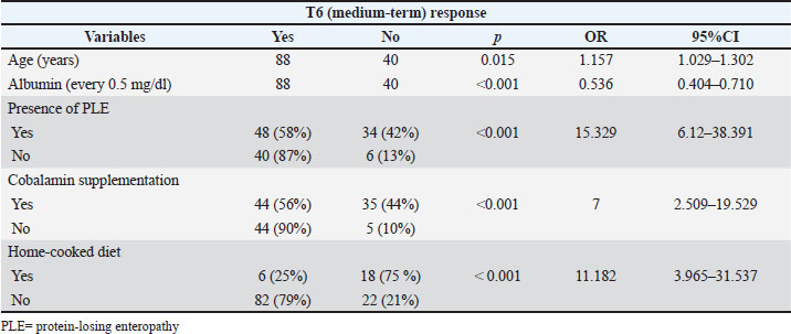 No significant differences in short- and medium-term responses were observed between dogs receiving monotherapy and those receiving multitherapy. Age (years), albumin (every 0.5 mg/dl), presence of PLE, cobalamin supplementation, and home-cooked diet were significantly associated with non-response at both T1 and T6 in the univariate analysis (Tables 2 and 3).