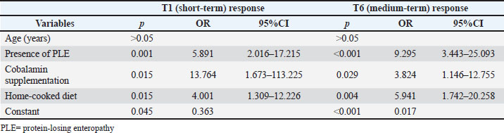 The presence of PLE, cobalamin supplementation, and a home-cooked diet were significantly associated with nonresponse at both T1 and T6 in the multivariate analysis (Table 4).