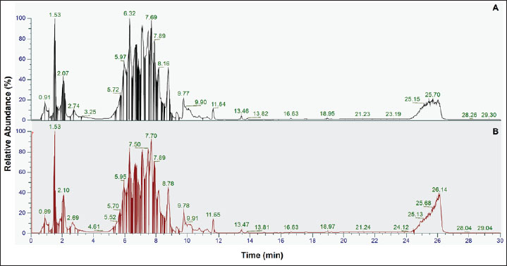 Fig. 2. TIC of porcine gelatin standard obtained from the process with reduction using DTT and alkylation using IAA steps (A) and without reduction and alkylation steps (B). Gelatin analysis of gummy candy and marshmallow samplesIn this study, LC-HRMS detected porcine gelatin in several samples of marshmallow and gummy candies obtained from markets. Table 4 shows the results of the analysis of commercial gummy candy and marshmallow samples obtained from different brands. Among the five gummy candies samples tested, two were positive for porcine gelatin. In addition, two marshmallow samples were found to contain porcine gelatin. Table 4. Identification of porcine gelatin peptide markers in commercial gummy candies and marshmallow samples.