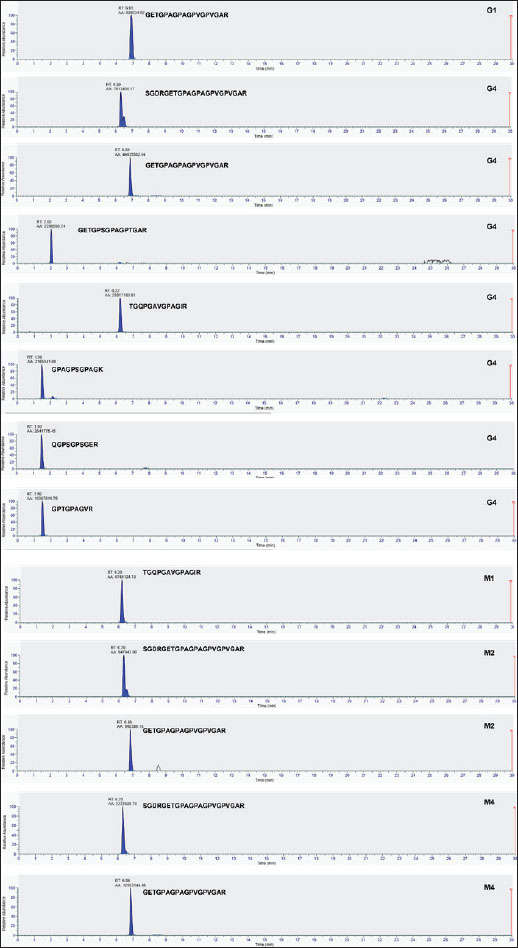 Fig. 1. The TIC of the gelatin standard was extracted using different extraction buffers: bovine gelatin-Tris HCl buffer pH 8.0 (A), bovine gelatin-ammonium bicarbonate pH 8.0 (B), porcine gelatin-Tris HCl buffer pH 8.0 (C), and porcine gelatin-ammonium bicarbonate pH 8.0 (D). Identification of peptide markers using bovine gelatin standardsThe identification of peptide markers from bovine gelatin standards is a critical process in the quality control and characterization of gelatin-derived products. To identify proteins and peptides in gelatin, LC-HRMS with Orbitrap mass analyzer was used. Table 1 shows the peptide markers found in bovine gelatin obtained from two different extraction buffers. In general, Tris-HCl (pH 8.0) and ammonium bicarbonate (pH 8.0) had similar performance in extracting peptides from bovine gelatin. Ten peptide markers of bovine gelatin were obtained using Tris-HCl (pH 8.0), whereas nine peptide markers were found in bovine gelatin using ammonium bicarbonate (pH 8.0). The peptides were obtained from the collagen alpha 1 chain and collagen alpha 2 chain. For all peptides, the same source of protein was found using Tris-HCl (pH 8.0) and ammonium bicarbonate (pH 8.0). Therefore, both extraction solvents resulted in similar results of peptide markers from bovine gelatin, except for the peptide GETGPAGPPGAPGAPGAPGPVGPAGK, which was only detected using Tris-HCl (pH 8.0). Table 1. Identification of peptide markers from bovine gelatin standard obtained from two different buffer extractions of Tris-HCl (pH 8.0) and ammonium bicarbonate (pH 8.0).