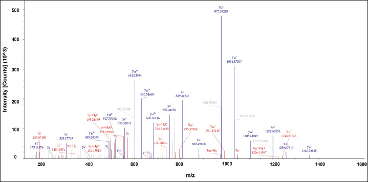 Fig. 4. Fragmentation spectra (MS2 spectra) of GETGPAGPAGPVGPVGAR, a peptide marker of porcine gelatin. Currently, the DNA-based method using RT-PCR is still the standard method for detecting the authenticity of gelatin (Gina et al., 2024). However, some studies have reported that RT-PCR often provides false results for detecting porcine gelatin. Using the DNA-based method, the extraction step is crucial because the presence of DNA in gelatin is very low due to the high processing steps applied to produce gelatin (Jannat et al., 2018; Yörük et al., 2024). Therefore, it might cause biased information related to the source of gelatin, resulting in invalid information regarding the halal authenticity status of gelatin and foods containing gelatin. Therefore, our developed method using LC-HRMS-based proteomics is highly promising as a powerful technique for the analysis of porcine gelatin and gelatin-containing foods. Limitations and prospectsDespite the advancements in LC-MS/MS for gelatin analysis, several challenges remain. The presence of sugar, fat, and stabilizers can inhibit the extraction of gelatin peptides from gummy candies and marshmallows. The degradation of gelatin during high-temperature processing (such as in marshmallow production) can also affect the quality of peptide markers, resulting in incomplete or inconsistent identification. Additionally, the complexity of the peptide profiles in processed food samples may require advanced data analysis methods and robust databases to accurately assign peptide sequences to gelatin components. Future research should focus on optimizing extraction protocols to improve peptide recovery and minimize interference from other ingredients. Furthermore, efforts to develop comprehensive peptide databases for different gelatin sources and processing conditions could enhance proteomic analysis accuracy and reliability. The integration of LC-MS/MS with other analytical techniques, such as infrared spectroscopy or nuclear magnetic resonance, could provide complementary data and improve the overall understanding of gelatin behavior in food systems. ConclusionUntargeted proteomics using LC-Orbitrap HRMS provides sensitive detection for the analysis of peptide markers of porcine and bovine gelatin in gelatin powder and foods containing gelatin. In this study, a simpler sample preparation technique was successfully developed to extract protein and peptides by reducing the number of steps and the use of chemical reagents. Moreover, a short gradient in LC was efficiently developed to separate peptides in gelatin, thereby providing an effective method in terms of analysis time with optimum results. Two types of extraction solvents, including Tris-HCl buffer (pH 8.0) and ammonium bicarbonate (pH 8.0), had good capability to extract proteins and peptides from gelatin with comparable results. This developed method was effectively applied to detect porcine gelatin in commercial gummy candies and marshmallow samples. This study proposed a powerful method for the analysis of porcine gelatin in gelatin powder and foods containing gelatin with simplified extraction techniques and short analysis time using LC-orbitrap high-resolution MS. This method is a promising standard method for the analysis of porcine gelatin for quality control and halal authentication of gelatin powder and foods containing gelatin. Therefore, further research using a broader range of food products is important. In addition, a targeted proteomics approach (quantitative proteomics analysis), validation methods, and standardization are required to obtain a valid, reliable, and reproducible method for the analysis of porcine gelatin in food and pharmaceutical products. AcknowledgmentThe authors acknowledge Corpora Science Research Laboratory for facilitating the LC-HRMS Orbitrap Exploris 240 instrument. The authors would like to thank Badan Penyelenggara Jaminan Produk Halal (BPJPH), Laboratorium BRIN Kawasan Yogyakarta, and Laboratorium Penelitian dan Pengujian Terpadu (LPPT) UGM for supporting this research. Conflict of interestThe authors declare no conflicts of interest associated with this research. FundingThis research was supported by the RIIM LPDP Grant and BRIN, grant number 172/IV/KS/11/2023 and 6815/UN1/DITLIT/Dit-Lit/KP.01.03/202. Author contributionsAW, HDW, YE, YK, NKAB, AR: conceptualization and design, drafted the manuscript MKA, AZH, AM: formal analysis and interpretation data, revised and edited the manuscript HIR: acquisition and participated in the preparation and critical checking of the manuscript. MF: edited the references and checking the manuscript for grammatical errors. All authors have read and agreed to the publication of the final version of the manuscript. Data availabilityAll data were provided in the manuscript. ReferencesAbdullah Sani, M.S., Ismail, A.M., Azid, A. and Samsudin, M.S. 2021. Forensic food models for the authentication and quantification of porcine adulterant in gelatin and marshmallow. Food Control 130, 108350; doi:10.1016/j.foodcontrol.2021.108350 Aini, S.R., Rohman, A., Erwanto, M., Handayani, A. and Irnawati. 2023. Metabolomics approach used for Halal authentication analysis of food and pharmaceutical products: a review. Food Res. 7(3), 180–187. Aydoğan, C. 2020. Recent advances and applications in LC-HRMS for food and plant natural products: a critical review. Anal. BioAnal. Chem. 412(9), 1973–1991; doi:10.1007/S00216-019-02328-6 Cai, S., Jiang, M., Zhao, K., Huang, X., Fei, F., Cao, B., Cui, X., Duan, J., Zhao, M., Han, S. and Liu, R. 2021. Quantitative strategy of ultrasound-assisted digestion combined with ultraperformance liquid chromatography-mass spectrometry (UPLC-MS/MS) for rapid identification of species-specific peptide markers in the application of food gelatin authentication. LWT - Food Sci. Technol. 147, 111590; doi:10.1016/J.LWT.2021.111590 Carrera, M., Abril, A.G., Pazos, M., Calo-Mata, P., Villa, T.G. and Barros-Velá