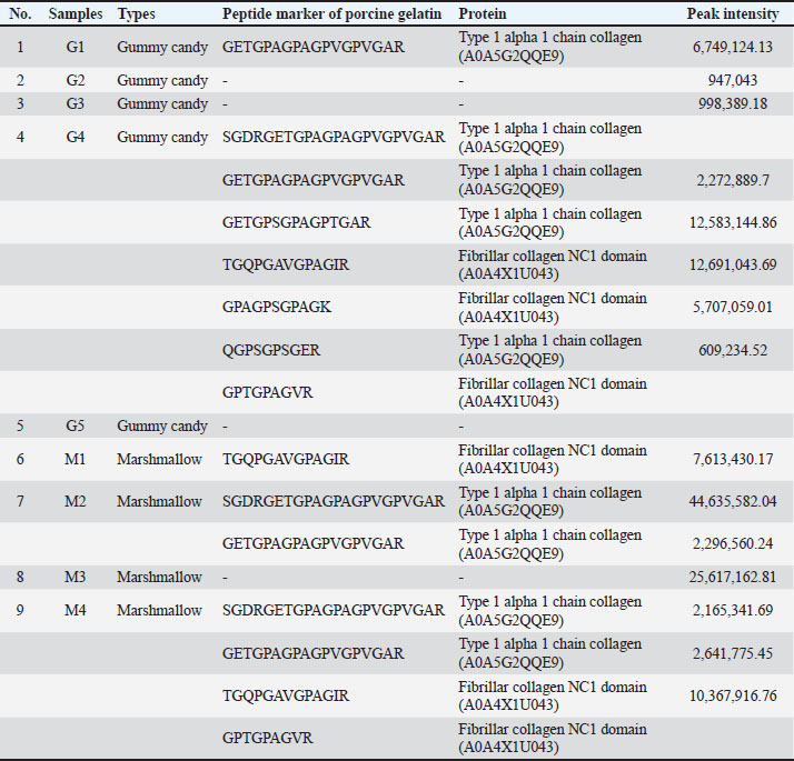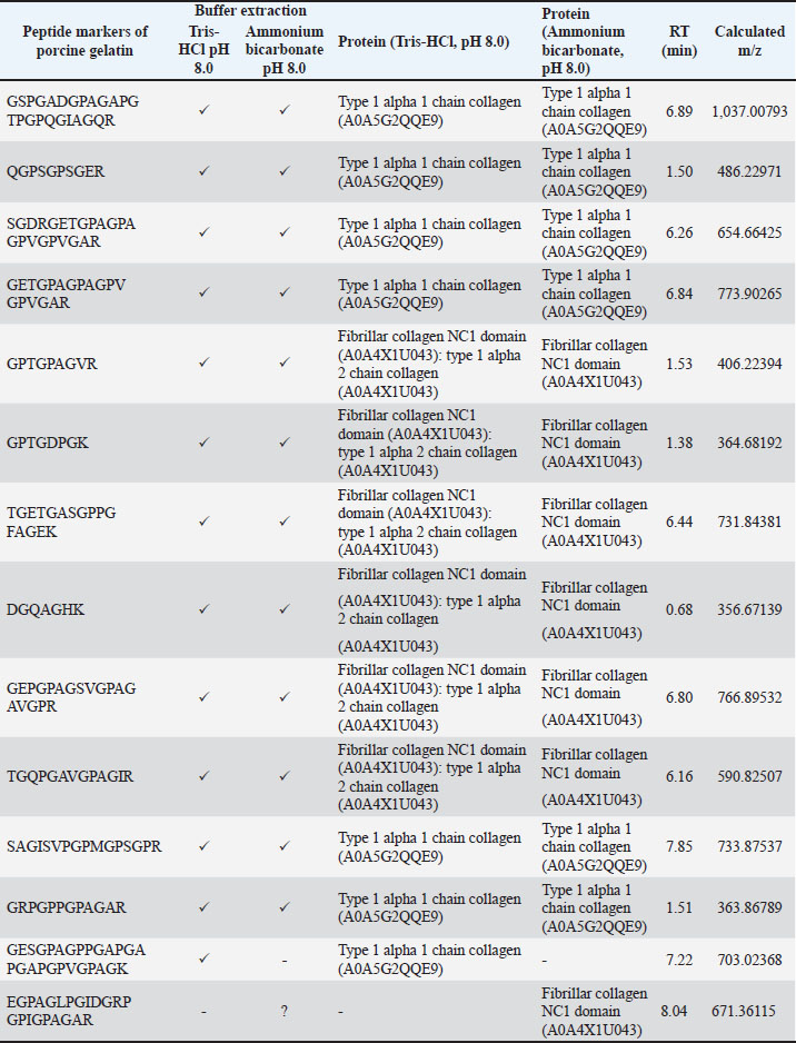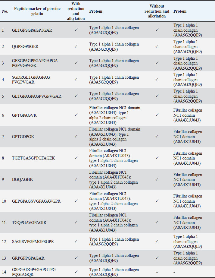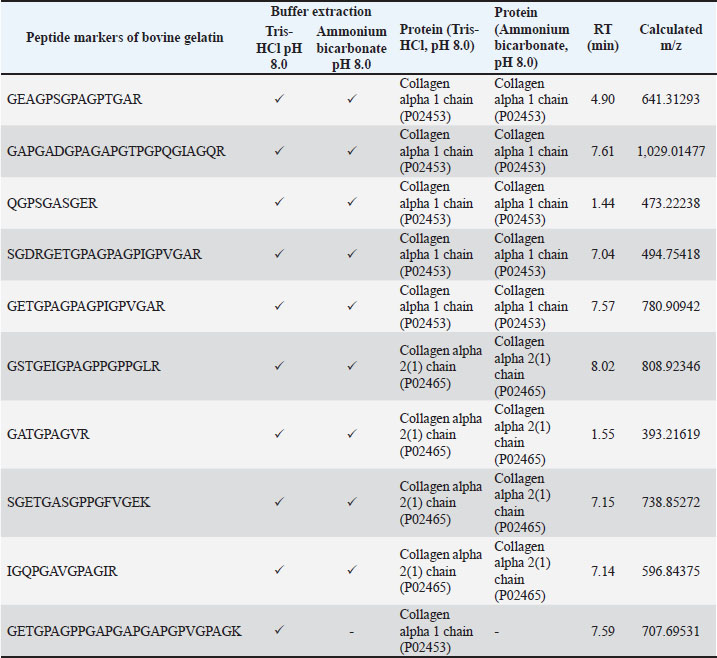 Identification of peptide markers using porcine gelatin standardsThe obtained peptide markers of porcine gelatin are shown in Table 2. The results showed that both Tris-HCl buffer (pH 8.0) and ammonium bicarbonate (pH 8.0) successfully detected porcine gelatin peptide markers with comparable performance. Proteins were extracted from the collagen alpha 1 chain and fibrillar collagen. The same number of 13 porcine gelatin peptide markers could be detected using both extraction solvents. However, there was a difference in the peptide of GESGPAGPPGAPGAPGAPGPVGPAGK, which was only detected in Tris-HCl buffer (pH 8.0). This peptide belongs to the Sus scrofa collagen type 1 alpha 1 chain. In contrast, the peptide marker of EGPAGLPGIDGRPGPIGPAGAR, which belongs to the fibrillar collagen protein NC1 domain, was only detected in porcine gelatin extracted using ammonium bicarbonate (pH 8.0). Table 2. Identification of peptide markers from porcine gelatin standard obtained from two different buffer extractions of Tris-HCl (pH 8.0) and ammonium bicarbonate (pH 8.0).