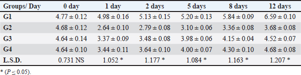 Fig. 4. FTIR spectra of chitosan nanoparticles loaded on aloe vera gel, showing the main functional groups and possible interactions between chitosan and aloe vera gel, indicating the success of the loading process and its effect on the chemical structure. Table 1. Pseudomonas aeruginosa count in mutton meat at Refrigerator temperature.