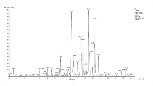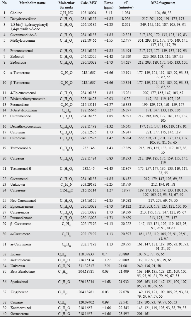 Fig. 1. UHPLC-Q-Orbitrap HRMS chromatogram of C. longa and C. zedoaria ethanol extracts. Putative identification of the compoundsThe chromatogram profile in Figure 1 indicates that the mixed ethanol extracts of C. longa and C. zedoaria contained several high concentrations of compounds. Most compounds dissociated at retention times of 8–24 minutes. This study identified 40 compounds by examining an internal database and conducting literature reviews of C. longa and C. zedoaria species, the Curcuma genus, and the Zingiberaceae family. They compared the MS2 spectra for identification (Table 2). The most prevalent metabolite, with a mass of 303.2919 and retention duration of 18.779 minutes, was not identified. These substances belong to the sesquiterpenoid, alkaloid, and sesquiterpene categories. UHPLC-Q-Orbitrap HRMS analysis identified 40 metabolites extracted using 96% ethanol from a combination of C. longa and C. zedoaria. Among the 40 detected metabolites, one was an unidentified compound with the molecular formula C21H37N, a molecular weight of 303.29192, and MS2 fragmentation patterns at 240, 136, 91, and 58. This compound is likely a novel substance, a metabolite derivative, or a minor product of metabolism. It is presumed to belong to a class of long-chain aliphatic amines or light alkaloid derivatives with a benzyl aromatic group and has not yet been documented in common metabolite databases (Klau et al., 2023; Wang et al., 2024). Curcuma zedoaria, a member of the Curcuma genus, has been used to treat various ailments (Fuloria et al., 2022). Analysis of UHPLC-Q-Orbitrap HRMS data tentatively identified compounds in C. zedoaria extract, primarily consisting of sesquiterpenoids (24 compounds), alkaloids (4), and sesquiterpenes (3). Previous studies have identified various sesquiterpenoids with diverse biological effects. These compounds exhibit diverse biological activities, including anti-inflammatory, anticancer, antimicrobial, antioxidant, and immunomodulatory effects. Furthermore, studies have demonstrated their capacity to inhibit angiogenesis and suppress TNF-α release from macrophages (Matsuda et al., 2001; Cox-Singh et al., 2008; Yuandani et al., 2021; Fuloria et al., 2022). Recent studies have shown that not all known C. zedoaria compounds are present in the extract. The untargeted metabolomics approach detected various sesquiterpenoid compounds, such as Curzeone, Zingiberene, Zedoalactone A and B, and Zedoarol. However, several compounds, including curcumin, curcumin, and neocurdione, have not yet been identified (Matsuda et al., 2001; Yuandani et al., 2021). In addition to sesquiterpenoids, only two known sesquiterpenes have been detected in C. zedoaria: curcumene and alpha-farnesene. The previously unreported sesquiterpene 3,4-Dihydrocadalene was also discovered. Flavonoids are powerful antioxidants that are regarded as secondary plant compounds (Jabbar et al., 2022). However, the flavonoid naringenin has not yet been identified. The cultivation location of a plant influences the presence and concentration of compounds in its extract. Numerous studies have consistently identified phenolic compounds, which are secondary compounds, as substances with antioxidant properties that can neutralize various free radicals (Taqi, 2014). Table 2. Putative identification of compounds in C. longa and C. zedoaria ethanol extracts.