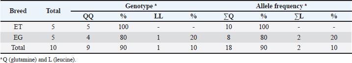 Table 3. PRNP genotype and allele frequencies in codon 127 of thin-tailed (ET) and fat-tailed (EG) Indonesian sheep.