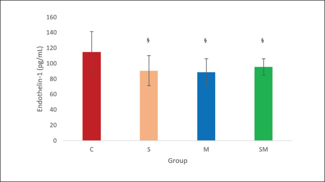 Fig. 4. Effects of sildenafil and metformin on ET-1. The result is presented as mean ± SD. §p=0.033 sildenafil compared with control, §p=0.013 metformin compared with control. §p=0.024 sildenafil + metformin compared with control. C=control; M=metformin; S=sildenafil; SM=sildenafil + metformin. In this study, three groups of treatment showed significant lowering of sPAP, dPAP, and mPAP compared with the control group. It is evident that the drug, either alone or in combination able to improve PH. This fact indicates the drugs have action in improving pulmonary vascular resistance. Previous studies have shown that sildenafil improves pulmonary vascular resistance via its vasodilatory effect by increasing the cyclic guanosine 3′,5′-monophophate level (Itoh et al., 2004). This agent also has action on decreasing expression of Endothelin type 1A receptor effect (Liu et al., 2007). Right ventricular function also improves because of its vasodilatory action (Yoshiyuki et al., 2016). Metformin is able to reduce PA vasoconstriction by enhancing endogenous nitric oxide (NO) phosphorylation (Agard et al., 2009). Moreover, this drug lowers PA pressure by decreasing ET-1 levels (Yoshida et al., 2020). Heart rate and SpO2 were similar in all groups, since MCT caused mild to moderate PH in 3rd–4th week by its administration. Our research evaluated small to moderate pulmonary arteries (50–200 µm) in which IMT is more prominent in PH (Humbert et al., 2019). The data showed that compared with the control group, the IMT of the sildenafil and metformin groups was thicker. However, when the IMT of sildenafil plus metformin was compared between the groups, the IMT value was significantly thinner. This fact showed that a single therapy is not enough to prevent pulmonary arterial remodeling. The intima media is the most affected pulmonary vascular area in patients with pulmonary arterial hypertension (PAH) (PH group 1). In the model, this PH group can be created by inducing rats with MCT (Maarman et al., 2013). The pulmonary vascular intima is lined with endothelial cells, and the medial is occupied by smooth muscle cells (Boucherat et al., 2022). IMT is the end result of works of proliferative mediators (Jia et al., 2023). In our research, the IMT of sildenafil plus metformin was significantly thinner than that of the other groups. This fact shows a combination of two drugs able to inhibit remodeling process of the PA. The sildenafil group, in our research, contrary with the findings of Schermuly et al. (2004), did not show improvement in arterial remodeling. This may have been caused by the relatively short use of sildenafil in our research (21 days) compared with the 42 days in previous research. This research revealed the domination of PASMCs in the sildenafil group and fibroblasts in the other treatment groups. This fact showed that sildenafil has more action on lowering fibroblast proliferation. Metformin, in other way, has more action on lowering PASMC proliferation. However, one should keep in mind that in a normal PA, PASMCs are dominating (Boucherat et al., 2022). Previous studies showed that sildenafil inhibits PASMC proliferation by upregulation of MKP expression and degradation of ERK1/2 phosphorylation (Li et al., 2007). This agent also potentiates antiproliferation of BMP4 in PASMCs. It seems that in the previous research, the antiproliferative effect of sildenafil was dose dependent. In our research, a sildenafil dose 5 mg/kg BW was probably inadequate to show antiproliferative effect. Metformin, in other ways, inhibits PASMC proliferation by decreasing ET-1 levels, which, in sequence, lower Skp2 and increase p27 (Wu et al., 2014; Yoshida et al., 2020). At the gene level, this agent causes PASMC apoptosis by lowering long noncoding RNA (Sun et al., 2019).