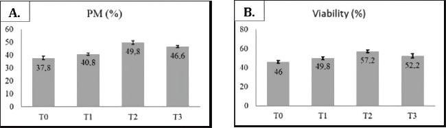 Fig. 1. Diagram showing the addition of green tea extract to egg yolk–milk diluent. (A) Progressive motility (%) and (B) viability (%) after thawing the semen of Gaok chicken.
