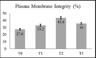 Fig. 2. Diagram of the addition of green tea extract to egg yolk–milk diluent plasma membrane integrity (%) after thawing the semen of Gaok chicken. SODThe post-thaw semen Gaok chicken analysis of variance (p < 0.05) showed a significant effect in treatment group T2 (Fig. 5) than in other groups which experienced a high increase so that SOD, which functions as the most important antioxidant enzyme that is already present in spermatozoa cells as a defense which is responsible for damage caused by radicals and ROS, is free. DiscussionTo prevent high ROS levels in cells, antioxidants, which act as free radical scavengers, are needed (Appiah et al., 2019). Natural sources of antioxidants are herbs as antioxidant derivatives which are associated with improving the quality of frozen semen (Rakha et al., 2023). The EGCG contained in green tea (Camellia sinensis) has antioxidant activity (Roychoudhury et al., 2017). The best result was found to be 0.10 mg of GTE per 100 ml of diluter, according to the measured characteristics. However, adding more GTE than that (0.05 mg/100 ml and 0.15 mg/100 ml) would result in a reduction in the quality of the cryopreserved semen from the Gaok chicken. Previously, anti-free radical compounds have become pro-oxidants or chemicals that stimulate the production of free radicals. Oxidative stress can arise from this, and cells can be harmed (Zahra et al., 2024).