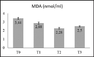 Fig. 4. Diagram addition of green tea extract to egg yolk–milk diluent and MDA (U/ml) after thawing the semen of Gaok chicken.