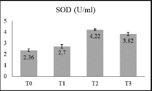 Fig. 5. Diagram showing the addition of green tea extract to egg yolk–milk diluent and superoxide dismutase (U/ml) after thawing the semen of Gaok chicken. The percentage of progressive motility is a crucial parameter for assessing semen quality, as such motility enables spermatozoa to traverse the female reproductive tract and reach the infundibulum for successful ovum penetration (Elbashir et al., 2018). The semen dilution and freezing processes cause oxidative stress in spermatozoa, which can form ROS. This finding is corroborated by other researchers who have indicated that semen from various male types exhibits differing levels of resistance to extreme conditions (Vašíček et al., 2022). The freezing process damages the function and structure of the membrane and the ability of spermatozoa to maintain life (Swelum et al., 2022). The plasma membrane of spermatozoa functions as a critical barrier that regulates the exchange of intraextracellular substances essential for metabolic processes (Roca et al., 2022). Previous studies have reported that the main cause of sperm freezing damage is due to an imbalance between cellular antioxidant defenses and the production of ROS (Zong et al., 2023). As shown in the table, the addition of green tea leaf extract significantly increased the levels of motility, viability, and plasma membrane integrity in the T2 group. One of the contents of green tea in the form of flavonoids acts as an oxidative chain reaction breaker by providing H-electrons so as to reduce oxidative stress and make the compound more stable (Wajdi et al., 2021). Susceptibility to cold temperatures is also associated with a high ratio of unsaturated fatty acids to saturated fats so that the ROS formed is also high, the end result of which is MDA (Mohan et al., 2013). High MDA levels experienced a significant decrease in the T2 group, and SOD levels also experienced a significant increase in the T2 group. Elevated ROS levels lead to increased oxidative stress, which is reflected by elevated MDA concentrations, which are markers of lipid peroxidation and membrane damage. Other than that, SOD, CAT, glutathione peroxidase, and glutathione reductase are the major antioxidant enzymes present in mammalian seminal plasma and are involved in the scavenging of ROS (Papas et al., 2019). After freezing, the damage increases the intracellular electrolyte concentration, which in turn promotes ice crystal formation. In severe cases, this damage can extend to the nuclear membrane (Neila-Montero et al., 2024). On the other hand, spermatozoa physiologically require low levels of ROS to maintain optimal function (Wagner et al., 2017). Disruptions in ROS and antioxidant levels can lead to redox imbalances. Excessive ROS levels or an overabundance of antioxidants can disturb this balance and adversely affect sperm health (Zahra et al., 2024). Specifically, high doses of GTE in the T3 group result in diminished ROS levels, which impaired normal sperm functionality. This phenomenon underscores the antioxidant paradox, in which excessive antioxidant levels can paradoxically compromise male fertility (Majzoub and Agarwal, 2018). Concurrently, the body’s antioxidant defenses, including SOD and CAT, attempt to mitigate this oxidative damage. However, if ROS levels overwhelm these antioxidant systems, the resultant oxidative stress can impair sperm function and viability. Thus, maintaining an optimal balance between ROS and antioxidant activity is crucial for preserving spermatozoa health and fertility. ConclusionThe addition of green tea leaf extract subsequently reduced MDA levels. The addition of GTE at a dose of 0.10 mg/100 ml of egg yolk–milk diluent can act as an antioxidant in maintaining the quality of post-thawing Gaok chicken spermatozoa. AcknowledgmentsThe authors thank Universitas Airlangga. Conflict of interestThe authors declare no conflict of interest. FundingThe authors thank the Directorate of Research and Community Service and Faculty of Veterinary Medicine, Airlangga University, for the PUF Fiscal Year 2018 (number: 1722/UN3.1.6/LT/2018). Author’s contributionsLaboratory work and data collection: TH, SS, AOA, and AAR. Field sampling: SBM, NN, and ASH. Data analysis and manuscript writing: ES, SM, TDL, and IM. Research concepts: ARK, NYD, RZA, and UFH. All authors have read and approved the final manuscript. Data availabilityAll data supporting the findings of this study are available in the manuscript, and no additional data sources are required. ReferencesAlipour-Jenaghard, P., Daghigh-Kia, H. and Masoudi, R. 2023. Preservation of the quality and fertility potential of post-thawed rooster sperm using MitoQ. Theriogenology 208(1), 165–170. Appiah, M.O., He, B., Lu, W. and Wang, J. 2019. Antioxidative effect of melatonin on cryopreserved chicken semen. Cryobiology 89(1), 90–95. Bebas, W., Gorda, I.W., Agustina, K.K. and Merdana, I.M. 2023. Effects of adding glutathione to andromed diluent on intact plasma and acrosome membranes and progressive otility of cattle spermatozoa during freezing processes. World’s Vet. J. 13(4), 561–570. Chen, I.J., Liu, C.Y., Chiu, J.P. and Hsu, C.H. 2016. Therapeutic effect of high-dose green tea extract on weight reduction: a randomized, double-blind, placebo-controlled clinical trial. Clin. Nutr. 35(3), 592–599. Diskin, M.G. 2018. Review: semen handling, time of insemination and insemination technique in cattle. Animal 12(1), s75–s84. Elbashir, S., Magdi, Y., Rashed, A., Ibrahim, M.A., Edris, Y. and Abdelaziz, A.M. 2018. Relationship between sperm progressive motility and DNA integrity in fertile and infertile men. Middle East Fertil. Soc. J. 23(3), 195–198. Getachew, T. 2016. A review article of artificial insemination in poultry. World’s Vet. J. 6(1), 25–33. Hamad, S.K., Elomda, A.M., Sun, Y., Li, Y., Zong, Y., Chen, J., Abbas, A.O., Stino, F.K.R., Nazmi, A. and Mehaisen, G.M.K. 2023. The in vitro evaluation of rooster semen pelle