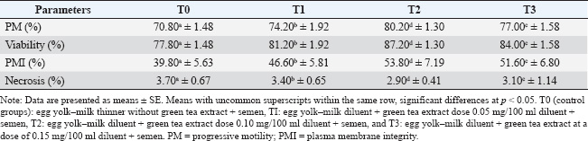 Table 2. Effects of green tea leaf extract (Camelia sinensis) on the semen quality of chicken after freezing.