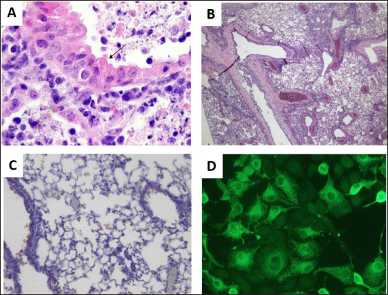 Fig. 4. SeV infection of a mouse lung. (A) Small eosinophilic cytoplasmic bodies (arrow) are seen in an airway epithelial cell (H & E, 200×). (B) Proliferative bronchitis is characterized by significant hyperplasia of epithelial cells, cilia loss, and desquamation of the bronchial epithelium (H & E, 40×). (C) Positive cells for the SeV antigen in the alveolar spaces and bronchial epithelium stained with immunoperoxidase, 100×. (D) Positive LLC-MK2 cells for the SeV antigen via immunofluorescence using a rabbit polyclonal anti-Sendai antibody, 400×. ConclusionIn conclusion, paramyxovirus infections in rodents are highly contagious and potentially harbor zoonotic potential, raising public health concerns. The shedding of infectious virus at the first 2 weeks of infection seems to be transmitted through direct contact, respiratory aerosol, and contaminated fomites. The clinical signs in paramyxovirus-infected animals are dyspnea, chattering, prolonged gestation, reduced growth, and even young mice death. Screening of incoming rodents, isolation, and depopulation of infected rodents should be performed as control and preventive measures for paramyxovirus infection. As a recommendation, thorough research should be conducted to gain more information on the virus and host interactions in terms of transmission, pathophysiology, and the natural host of the paramyxoviruses due to reported zoonotic cases. Although the knowledge of the virus and host interaction is scarce, further study on the zoonotic potential of paramyxovirus infections due to the possibility of the virus continuously mutating among the rodent species is needed. AcknowledgmentsThis work was supported by UPM as a research grant provider (UPM/GP-IPS/2021/9705100). Conflict of interestThe authors declare that there is no conflict of interest. Authors’ contributionsNAAR reviewed the previous papers. NFSH wrote the article and edited the final draft of the manuscript. All authors read and approved the final manuscript. ReferencesAppell, L., Kovatch, R., Reddecliff, J.M. and Gerone, P.J. 1971. Pathogenesis of Sendai virus infection in mice. Am. J. Vet. Res. 32(11), 1835–1841. Barthold, S.W., Griffey, S.M. and Percy, D.H. 2016. Pathology of laboratory rodents and rabbits, 4th ed. Hoboken, NJ: Wiley Online Library. Bellini, W.J. and Rota, P.A. 2011. Biological feasibility of measles eradication. Virus. Res. 162(1–2), 72–79. Berto, A., Anh, P.H., Carrique-Mas, J.J., Simmonds, P., Van Cuong, N., Tue, N.T., Van Dung, N., Woolhouse, M.E., Smith, I., Marsh, G.A., Bryant, J.E., Thwaites, G.E., Baker, S., Rabaa, M.A. and Consortium VIZIONS. 2017. Detection of potentially novel paramyxovirus and coronavirus viral RNA in bats and rats in the Mekong Delta region of southern Vietnam. Zoonoses Public Health 65(1), 30–42. Brook, C.E. and Dobson, A.P. 2015. Bats as “special” reservoirs for emerging zoonotic pathogens. Trends Microbiol. 23(3), 172–180. Brooks, F., Wood, A.R., Thomson, J., Deane, D., Everest, D.J. and McInnes, C.J. 2014. Preliminary characterisation of Pentlands paramyxovirus -1, -2 and -3, three new paramyxoviruses of rodents. Vet. Microbiol. 170(3–4), 391–397. Brownstein, D.G., Smith, A. and Johnson, E. 1981. Sendai virus infection in genetically resistant and susceptible mice. Am. J. Pathol. 105(2), 156–163. Brownstein, D.G. 1985. Sendai virus infection, lung, mouse and rat. In Respiratory system: monographs on pathology of laboratory animals. Eds., Jones, T.C., Mohr, U. and R.D. Hunt. Heidelberg, Germany: Springer, pp: 195–203. Campbell, R.W., Carley, J.G., Doherty, R.L., Domrow, R., Filippich, C., Gorman, B.M. and Karabatsos, N. 1977. Mossman virus, a paramyxovirus of rodents isolated in Queensland. 8(11–12), 435–436. Chen, J.J., Zhang, X.A., Fan, H., Jiang, F.C., Jin, M.Z., Dai, K., Wang, N., Zhang, P.H., Li, X.K., Li, H., Shi, W., Yang, Z.C., Fang, L.Q., Zhou, H.S., Wei, Y.H. and Liu, W. 2020. Distribution and characteristics of Beilong virus among wild rodents and shrews in China. Infect. Genet. Evol. 85, 104454. Dahmana, H., Granjon, L., Diagne, C., Davoust, B., Fenollar, F. and Mediannikov, O. 2020. Rodents as hosts of pathogens and related zoonotic disease risk. Pathogens. 9(3), 202. Drexler, J.F., Corman, V.M., Müller, M.A., Maganga, G.D., Vallo, P., Binger, T., Gloza-Rausch, F., Cottontail, V.M., Rasche, A., Yordanov, S., Seebens, A., Knörnschild, M., Oppong, S., Sarkodie, Y.A., Pongombo, C., Lukashev, A.N., Schmidt-Chanasit, J., Stöcker, A., Carneiro, A.J.B., Erbar, S., Maisner, A., Fronhoffs, F., Buettner, R., Kalko, E.K.V., Kruppa, T., Franke, C.R., Kallies, R., Yandoko, E.R.N., Herrler, G., Reusken, C., Hassanin, A., Krüger, D.H., Matthee, S., Ulrich, R.G., Leroy, E.M. and Drosten, C. 2012. Bats host major mammalian paramyxoviruses. Nat. Commun. 3(1), 1–13. Faísca, P. and Desmecht, D. 2007. Sendai virus, the mouse parainfluenza type 1: a longstanding pathogen that remains up-to-date. Res. Vet. Sci. 82(1), 115–125. Han, H.J., Wen, H.L., Zhou, C.M., Chen, F.F., Luo, L.M., Liu, J.W. and Yu, X.J. 2015. Bats as reservoirs of severe emerging infectious diseases. Virus. Res. 205, 1–6. Itoh, T., Iwai, H. and Ueda, K. 1991. Comparative lung pathology of inbred strains of mice resistant and susceptible to Sendai virus infection. J. Vet. Med. Sci. 53(2), 275–279. Jack, P.J.M., Boyle, D.B., Eaton, B.T. and Wang, L.F. 2005. The complete genome sequence of J virus reveals a unique genome structure in the family Paramyxoviridae. J. Virol. 79(16), 10690–10700. Jun, M., Karabatsos, N. and Johnson, R. 1977. A new mouse paramyxovirus (J Virus). Aust. J. Exp. Biol. Med. Sci. 55(6), 645–647. Karabatsos, N., Buckley, S.M. and Ardoin, P. 1969. Nariva virus: further studies, with particular reference to its hemadsorption and hemagglutinating properties. Exp. Biol. Med. 130(3), 888–892. Kido, H., Yokogoshi, Y., Sakai, K., Tashiro, M., Kishino, Y., Fukutomi, A. and Katunuma, N. 1992. Isolation a