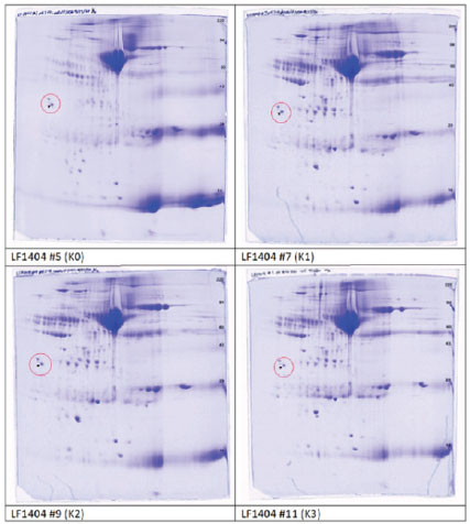 Table 3. Summary of results for 2D gel comparison of K1, K2, and K3 vs. K0. Reference spot numbering (38–72), pI, and MW are given for changing polypeptide spots analyzed in samples K1 (LF1404 #7–8), K2 (LF1404 #9–10), K3 (LF1404 #11, LF1406 #3), and K0 (LF1404 #5–6). Also shown are fold increases or decreases (difference) of the polypeptides for K1, K2, and K3 vs. K0.