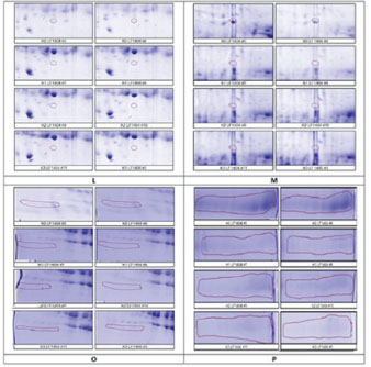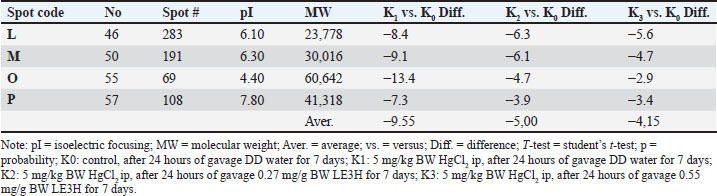Figure 5. Four selected protein spots (L, M, O, and P) presence significantly decreased influenced by HgCl2 treatment, and then LE3H administration returned the presence of these proteins to close to control conditions. The red circles indicate the selected protein spots. Table 5. K1 versus K0, K2 versus K0, and K3 versus K0 of the four protein spots (L, M, O, and P) for protein identification in accordance with the experimental hypothesis.