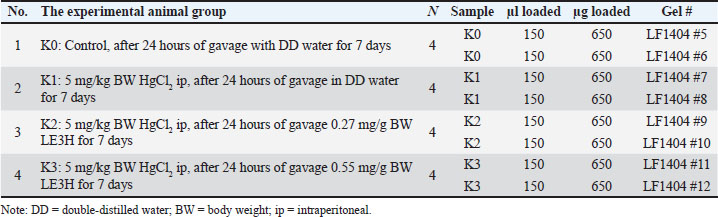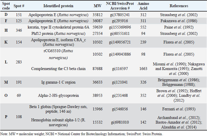 Address limitationsThe eight serum protein spots (D, F, H, K, L, M, O, and P) obtained from this toxicoproteomics research should be further verified with antibodies using western blotting (Ruyani et al., 2003; Ruyani et al, 2005; Cruz-Walma and Collins, 2019). Western blotting is a scientific technique used to identify and examine proteins in a sample. It is sometimes referred to as immunoblotting or protein blotting. ConclusionMercury chloride (HgCl2) increased the intensity of four serum protein spots—D [gi|37805241, Apolipoprotein E (R. norvegicus)], F [gi|295916, Apolipoprotein E (R. norvegicus)], H [gi|155369696, keratin, type II cytoskeletal 6A; gi|60551611, Phf12 protein (R. norvegicus)], and K [gi|149056721, Apolipoprotein E, isoform CRA_c (R. norvegicus)]—intensity increased before, leaf ethanolic extract of Etlingera hemisphaerica (LE3H) caused the protein profiles to drop to almost control levels. On the other hand, the four serum protein spots are L [gi|149043886, rCG63310 (R. norvegicus); gi|116597, Hemoglobin subunit alpha-1/2 (R. norvegicus)], M [gi|121041, Ig gamma-1 chain C region], O [gi|231468, Alpha-2-HS-glycoprotein], and P [gi|546056, Beta 1 globin (rats, Sprague-Dawley, Peptide, 146 aa); gi|6981010, Hemoglobin subunit alpha-1/2 (R. norvegicus)]. These spots were reduced in intensity as a result of HgCl2, and subsequently LE3H caused the protein profiles to rise toward control levels. LE3H may serve as a potential herbal agent to mitigate mercury-induced systemic toxicity via the modulation of serum protein expression. AcknowledgmentsThe Directorate General of Higher Education, Government of the Republic of Indonesia, supported this research under “Hibah Penelitian Dasar 2019”. The authors would like to thank Dr. Bhakti Karyadi (Department of Biological Education, Bengkulu University, Indonesia), Kendrick Laboratories Inc (1202 Ann St., Medison WI 53713, USA), Dr. Costel Darie (Department of Chemistry and Biomolecule, Clarkson University, 8Clarkson Avenue, Box 5810, Potsdam, NY 13699, USA) for the esteemed suggestions in conducting the study, Nurus Sa’adiyah for the statistical examination, and Shafira R. Ruyani for the grammatical advice in writing this work. Conflict of interestThe authors reported that they have no conflicts of interest. FundingThis study was supported by the Republic of Indonesian Government’s Directorate General of Higher Education’s “Hibah Penelitian Dasar 2019” (Nomor 779/U30.15/LT/2019). Authors’ contributionsThe final draft of the manuscript has been read, examined, and approved by all authors. AR: a research idea creator, a research funding receiver, a publishing paper finalizer, and a corresponding author; DP, DS, and ZFR: E. hemisphaerica leaf ethanolic extract (LE3H) production, experimental animal research, and data gathering; ATR and DRAM: Statistical tests for generalization; DP and ADS: Research project manager and report writer. Data availabilityThe data underpinning this study’s conclusions are not publicly available due to sensitivity issues, but may be acquired from the corresponding author upon a fair request. ReferencesAlauddin, H., Jaapar, N.A., Azma, R.Z., Ithnin, A., Razak, N.F.A., Loh, C.K., Alias, H., Abdul-Latiff, Z. and Othman, A. 2014. A case series of α-thalassemia intermedia due to compound heterozygosity for Hb Adana HBA2: c179Gu003eA (or HBA1); p. Gly60Asp with other α-thalassemias in Malay families. Case Rep. Hemoglobin. 38(4), 277–281; doi:10.3109/03630269.2014.916720 American Veterinary Medical Association. (2013). AVMA–Guidelines for the euthanasia of animals: 2013 Edition. Illinois, IL: American Veterinary Medical Association, p: 4.8 Anderson, N.L., Matheson, A.D. and Steiner, S. 2000. Proteomics: application in basic and applied biology. Curr. Appl. Biol. 11(00), 408–412. Archambaud, C., Nahori, M.N., Soubigou, G., Bécavin, C., Laval, L., Lechat, P., Smokvina, T., Langella, P., Lecuit, M. and Cossart, P. 2012. Effect of lactobacilli on orally acquired listeriosis. Proc. Natl. Acad. Sci. U. S. A. 109(41), 16684–16169; doi:10.1073/pnas.1212809109 Arnason, G. 2020. The emergence and development of animal research ethics: a review with a focus on nonhuman primates. Sci. Eng. Eth. 26, 2277–2293; doi:10.1007/s11948-020-00219-z Aslebagh, R., Channaveerappa, D., Arcaro, K.F. and Darie, C.C. 2018. Comparative two‐dimensional polyacrylamide gel electrophoresis (2D‐PAGE) of human milk to identify dysregulated proteins in breast cancer. Electrophoresis 39, 1723–1734. Bastos-Amador, P., Royo, F., Gonzalez, E., Conde-Vancells, J., Palomo-Diez, L., Borras, F.E. and Falcon-Perez, J.M. 2012. Proteomic analysis of microvesicles from plasma of healthy donors reveals high individual variability. J. Proteomics. 2012;75(12):3574–3584; doi:10.1016/j.jprot.2012.03.054 Beasley, D.M., Schep, L.J., Slaughter, R.J., Temple, W.A. and Michel, J.M. 2014. Full recovery from a potentially lethal dose of MC. Med. Toxicol. 10, 40–44. Brown, W.M., Christie, D.L., Dziegielewska, K.M., Saunders, N.R. and Yang, F. 1992. The rat protein encoded by clone pp63 is a fetuin/albha 2-HS glycoprotein-like molecule, but is it the tyrosine kinase inhibitor pp63? Comparative Study Cell. 68(1), 7–8; doi:10.1016/0092-8674(92)90200-v Brüggemann, M. 1988. Evolution of the rat immunoglobulin gamma heavy-chain gene family. Comparative Study Gene. 74(2), 473–482; doi:10.1016/0378-1119(88)90180-1 Brüggemann, M., Free, J., Diamond, A., Howard, J., Cobbold, S. and Waldmann, H. 1986. Immunoglobulin heavy chain locus of the rat: striking homology to mouse antibody genes Comparative Study. Proc. Natl. Acad. Sci. U. S. A. 83(16), 6075–6079; doi:10.1073/pnas.83.16.6075 Camacho, L.F., Silva, T.E., Palma, M.N.N., Assunção, A.S., Rodrigues, J.P., Silva, L.F.C.E. and Detmann, E. 2019. J. Anim. Sci. 97(2), 922–931; doi:10.1093/jas/sky464 Channaveerappa, D., Lux, J.C., Wormwood, K.L., Heintz, T.A., McLerie, M., Treat, J.A
