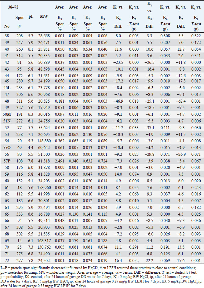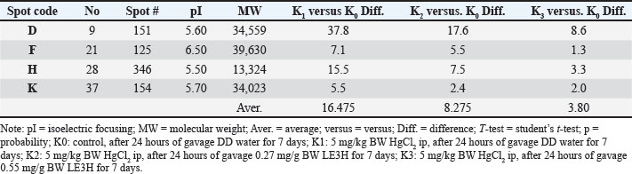 Protein separationThe two-dimensional sodium dodecyl sulfate-polyacrylamide gel electrophoresis (2-D SDS-PAGE) technique applied in this research effectively resolved the rat serum proteins into a total of 72 distinct spots, as presented in Figure 1, Figure 2, Table 2, and Table 3. Each spot with MW and isoelectric focusing (pI) is thought to describe one protein with a specific function. The protein spots in the control group (K0) are standard under normal conditions. The impact of HgCl2 on protein spot intensity expression is represented by the ratio of K1 to K0 (K1 vs. K0), while the recovery effect of 0.27 mg/g BW LE3H on mercury toxicity is represented by the ratio of K2 to K0 (K2 vs. K0). The dose of 0.55 mg/g BW LE3H on mercury toxicity is the ratio of K3 to K0 (K3 vs. K0). There are two interesting protein profile patterns in K1versusK0, K2versusK0, and K3versusK0 in this study: (1) HgCl2 treatment increases the intensity of real protein spots more than the control; then, administration of two doses of LE3H decreases the intensity of protein spots approaching control conditions (Fig. 3; Table 4; spot codes A, B, C, D, E, F, G, H, I, J, and K); and (2) HgCl2 treatment decreases the intensity of real protein spots less than the control; then, administration of two doses of LE3H increases the intensity of protein spots approaching control conditions (Fig. 3; Table 4; spot codes L, M, N, O, and P). Proteins whose expression rises or falls in response to HgCl₂ and then returns to levels around the control because of LE3H.