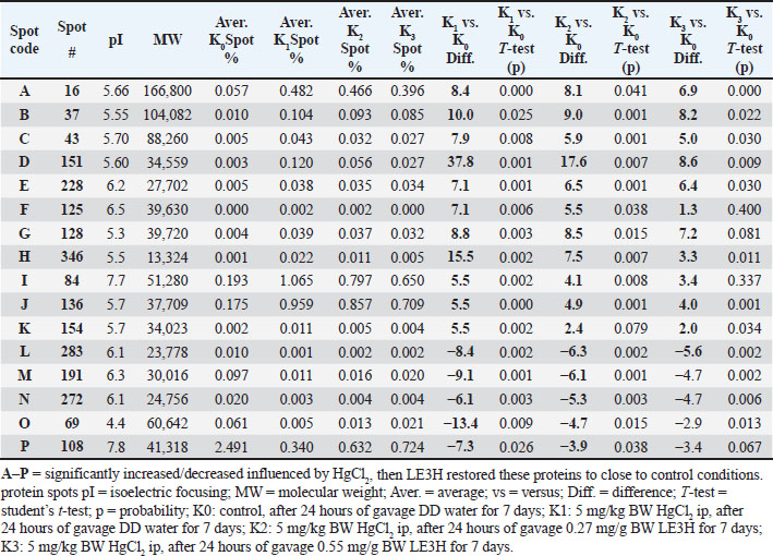 Figure 3. Sixteen initial protein spots selection (A, B, C, D, E, F, G, H, I, J, K, L, M, N, O, and P) presence significantly increased or decreased influenced by HgCl2 treatment, and then LE3H administration returned the presence of these proteins to close to control conditions. Toxicity of HgCl₂Previous research showed that HgCl₂ injection elevated leukocyte levels while diminishing erythrocyte counts; however, following the injection of HgCl₂ with LE3H therapy, the quantity of blood cells and the control were maintained. LE3H therapy was able to maintain this protein profile in the same manner as it was in the control condition, despite the 48-kDa protein being overexpressed and a new 125-kDa protein emerging as a result of the HgCl2 treatment. Mouse blood reveals that LE3H might offer some defense against HgCl2 poisoning. For this one-dimensional blood serum protein profile, more research employing proper techniques is necessary. Therefore, those who have been exposed to HgCl2 may benefit from taking dietary supplements that include LE3H (Ruyani et al., 2019). Furthermore, four bands with measurements of 264.77, 219.53, 98.57, and 37.29 kDa were observed in the electropherograms. After treatment with HgCl2, the strength of these bands increased noticeably. When LE3H was administered, the intensity dropped to almost the control condition. In addition, four bands—31.95, 28 06, 26, 29, and 15.09 kDa—were found in the results. The HgCl2 treatment caused these bands’ intensities to rise substantially, and when LE3H was profiled closer to control conditions, they started to resemble the control state. According to Ruyani et al. (2023), the LE3H change profile of the eight blood serum protein bands caused by HgCl2 substantially represents the control condition in R. norvegicus. Following the conclusion that HgCl2 can alter the protein profile, administering LE3H may alter the protein profile to more closely resemble control conditions. A flavonoid called QC is also found in LE3H, and LE3H raises protein levels close to the control level. Table 4. K1 vs. K0, K2 vs. K0, and K3 vs. K0 of the 16 initial protein spots selection (A, B, C, D, E, F, G, H, I, J, K, L, M, N, O, and P) were significantly increased or decreased influenced by HgCl2 treatment, and then LE3H administration returned the presence of these proteins to close to control conditions.