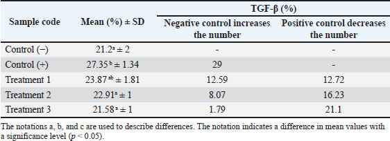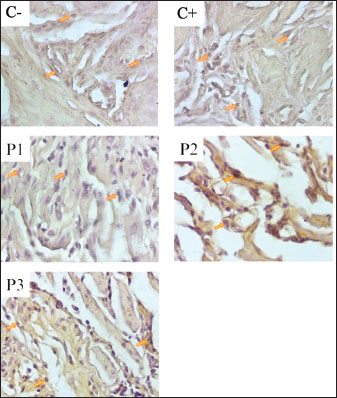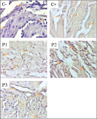 Fig. 2. Immunohistochemical staining of TGF- β expression in uterine tissue of pregnant mice. Positive TGF-β expression is indicated by brown-stained nuclei, highlighted by orange arrows. Tissue sections were stained using immunohistochemistry and observed under a light microscope at 400× magnification. The image was captured using a Nikon Eclipse Ei microscope. The results of the TGF-β expression examination showed that the positive control (C+) experienced a 29% increase from the negative control (C) with an average of 27.35 ± 1.34; the treatment group (P1) with 135 dB noise induction for 40 minutes and 14 mg/kg nanocurcumin therapy showed a 12.59% increase from (C) with an average of 23.87 ± 1.81; the treatment group (P2) with 135 dB noise induction for 40 minutes and 21 mg/kg nanocurcumin showed an 8.07% increase from (C) with an average of 22.91 ± 1; and the treatment group (P3) given 135 dB noise induction for 40 minutes and 24.5 mg/kg nanocurcumin showed a 1.79% increase from (C) with an average of 21.58 ± 1. Compared with the positive control (C+), each treatment experienced a decrease of 12.72%, 16.23%, and 21.1% in P1, P2, and P3, respectively. Therefore, it can be concluded that the highest increase in (C) and decrease in (C+) were observed in group (P3). The results of the TGF-β expression examination in the uterus of pregnant mice are shown in Table 2. DiscussionThe results of this study showed that there was no significant difference between groups (C−) and (P3) with an increase in VEGF of 3.55% and an increase in TGF-β of 1.79%. This shows that nanocurcumin administration has anti-inflammatory activity. In accordance with previous studies, curcumin has strong anti-inflammatory, antioxidant, anti-angiogenic, and anti-carcinogenic activities, and the nanoemulsion method has been proven to be effective. Thus, the use of nanoparticles can increase bioavailability and absorption in the body to achieve therapeutic effects, even when used in low doses (Mohammed et al., 2020). Inflammation can occur in various organs, including the uterus and placenta. Inflammation may reduce oxygen supply to the fetus, as seen in Hendrawan et al. (2017), because of an increase in inflammatory cytokines, which then enter the organs through the blood vessels. Cytokines, particulates, and hydroxyl radicals carried by blood to the placenta can affect cell membrane permeability. As a result, blood viscosity increases, which decreases the oxygen supply to the fetus. Hypoxia in the fetus can occur if the oxygen flow between the mother and fetus is disrupted through the placenta. Hypoxia is a condition of decreased blood oxygen levels that can disrupt the normal function of cells and organs. Placental hypoxia can cause abnormal placental villi development, a decrease in the number of villous and extravillous cytotrophoblasts, and suboptimal placental implantation, leading to trophoblast invasion. Trophoblasts produce VEGF and other angiogenic factors that support blood vessel formation in the placenta (Ozgokce et al., 2023). Oxygen supply to fetal tissues is reduced under hypoxic conditions, which can trigger physiological reactions, including activation of the inflammatory response. Fetal hypoxia can cause inflammation, potentially leading to premature birth or impaired fetal development (Burton and Jauniaux, 2018). Inflammation triggers the release of cytokines to prevent further damage. These cytokines activate macrophages to repair damaged tissue (Litchman et al., 2016). One of the pro-inflammatory cytokines involved in hypoxia is VEGF, the increase of which stimulates the formation of new blood vessels (angiogenesis) (Johnson and Wilgus, 2014). Unbalanced VEGF expression due to inflammatory factors in blood vessels can cause endothelial dysfunction, a condition in which the endothelial cells lining the walls of blood vessels do not function properly. In response to damage, the hypothalamus responds to inflammation by producing cytokines or growth factors, which affect endothelial function. This causes increased endothelial permeability, allowing inflammatory cells and large molecules, such as plasma, to exit the blood vessels and enter the inflamed tissue (Scheiner et al., 2019). Table 2. Results of TGF-β expression examination.