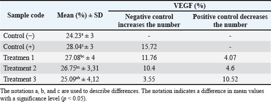 Fig. 1. Immunohistochemical staining of VEGF expression in the uterine tissue of pregnant mice. Positive VEGF expression is indicated by brown-stained nuclei, highlighted by orange arrows. Tissue sections were stained using immunohistochemistry and observed under a light microscope at 400× magnification. The image was captured using a Nikon Eclipse Ei microscope. Effect of Nanocurcumin Administration on TGF-β Expression in the Uterus of Pregnant Mice Under Stress ConditionsThe results of the study on the effects of nanocurcumin administration in mice (M. musculus) models on TGF-β expression showed an increase in the positive control group compared to the negative control group, while there was a decrease in the therapy group compared to the positive control group. This indicates that TGF-β expression will increase under stress conditions during pregnancy and will decrease if nanocurcumin therapy is administered. In Figure 2, the positive results are indicated by the brown color in the cell nuclei (endothelial cells). The more concentrated the color, the stronger the interaction between TGF-β in the mice uterus and the antibody used; the weaker the bond, the weaker the interaction. Negative results are indicated by the purple or bluish color in the cell nuclei. TGF-β expression in the uterus of pregnant mice can be seen in the following: Table 1. Results of the VEGF expression examination.