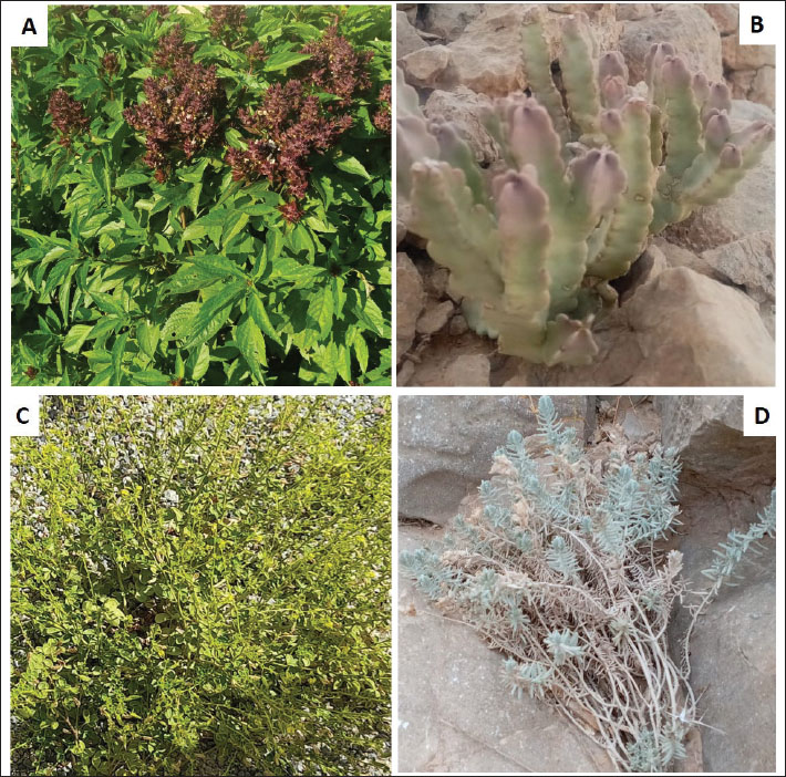 Fig. 1. Representative specimens of plant species. A: Ocimum basilicum; B: Caralluma arabica; C: Cleome amblyocarpa; D: Teucrium polium.