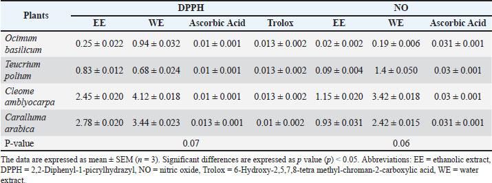 where Ac: absorbance of the control and As: absorbance of the sample. The experiments were performed in triplicate (Zourgui et al., 2020; Ben Lataief et al., 2021). Ferric reducing antioxidant power assay (FRAP)The FRAP of the extracts was evaluated using the method described by Yildirim et al. (2001). Briefly, 1 ml of each plant extract was mixed with 2.5 ml of 1% (w/v) potassium ferricyanide solution and 2.5 ml of 0.2 M phosphate buffer (pH 6.6). After incubation at 50 °C for 30 minutes, 2.5 ml of 10% (w/v) trichloroacetic acid was added to the solution. The mixture was then centrifuged at 5,000 rpm for 10 minutes. The supernatant (2.5 ml) was mixed with 0.5 ml of 0.1% (w/v) ferric chloride and 2.5 ml of distilled water. The absorbance was measured at 700 nm. A higher absorbance indicates greater reducing power. The experiment was repeated three times. ABTS radical scavenging activityThe ABTS radical scavenging activity was evaluated using the Trolox equivalent antioxidant capacity (TEAC) assay according to Chang et al. (2008). ABTS radicals were generated by mixing 5 ml of ABTS+ solution (7 mM) with 88 µl of potassium persulfate (2.456 mM). The mixture was incubated in the dark for 12–16 hours to allow complete radical formation. The ABTS radical solution was then diluted with ethanol to achieve an absorbance of 0.70 ± 0.02 at 734 nm. For the assay, 200 µl of each extract (1 mg/ml) was mixed with 2 ml of the ABTS radical solution. The absorbance was recorded after 6 minutes, and antioxidant activity was expressed as mM Trolox equivalents. Lower absorbance values indicate stronger antioxidant activity. All experiments were conducted in triplicate (Zourgui et al., 2020; Ben Lataief et al., 2021). Total antioxidant capacity (TAC) determined using the phosphomolybdenum methodThe TAC was measured using the phosphomolybdenum method described by Phatak and Hendre (2014), Izuegbuna et al. (2019), Kumari et al. (2023), and Kumari et al. (2024). Briefly, 300 µl of each extract (1 mg/ml) was mixed with 3 ml of a freshly prepared reagent solution containing 28 mM sodium phosphate, 0.6 M sulfuric acid, and 4 mM ammonium molybdate. The mixture was then incubated at 95°C for 90 minutes. Absorbance was measured at 695 nm against a blank reagent. Results were expressed as mg of AAE per gram of extract (mg AAE/g) (Zourgui et al., 2020; Ben Lataief et al., 2021). Statistical analysisThe experimental results were obtained from three independent replicates and are presented as mean ± standard error of the mean (n=3). A one-way analysis of variance was used to analyze differences among groups, followed by the least significant difference post-hoc test to assess significance at a 5% probability level (p ≤ 0.05). Ethical approvalNot needed for this study. ResultsTable 1 summarizes the antioxidant activity of ethanolic and water extracts from four Omani plants, assessed using five assays: DPPH, NO radical scavenging, FRAP, TEAC, and TAC. Ascorbic acid and Trolox were used as standard reference antioxidants. DPPH free radical scavenging activityAll plant extracts and standards exhibited dose-dependent DPPH scavenging activity, with lower absorbance indicating higher activity. Ascorbic acid (IC50=0.01 ± 0.001 mg/ml) and Trolox (IC50=0.013 ± 0.002 mg/ml) exhibited the highest activity. Among the extracts, O. basilicum EE displayed the strongest DPPH scavenging activity (IC50=0.25 ± 0.022 mg/ml). In general, EE exhibited greater DPPH scavenging activity than WE, except for T. polium, where WE (IC50=0.68 ± 0.024 mg/ml) outperformed EE (IC50=0.83 ± 0.012 mg/ml). However, the difference between EE and WE was not statistically significant (p=0.07). NO radical scavenging activityTable 1 presents NO radical scavenging activity, reported as IC50 values. Ocimum basilicum EE exhibited the strongest NO scavenging effect (IC50=0.02 ± 0.002 mg/ml), exceeding that of ascorbic acid (IC50=0.031 ± 0.001 mg/ml). The next most active extracts were T. polium EE (IC50=0.09 ± 0.004 mg/ml), C. arabica EE (IC50=0.93 ± 0.031 mg/ml), and C. amblyocarpa EE (IC50=1.15 ± 0.020 mg/ml). Aqueous extracts showed slightly lower NO scavenging activity, with IC50 values of 0.19 ± 0.006, 1.4 ± 0.050, 3.42 ± 0.018, and 2.42 ± 0.015 mg/ml for O. basilicum, T. polium, C. amblyocarpa, and C. arabica, respectively. However, the difference between EE and WE was not statistically significant (p=0.06). Table 1. DPPH and NO radical-scavenging activities of O. basilicum, T. polium, C. arabica, and C. amblyocarpa ethanolic and water extracts.