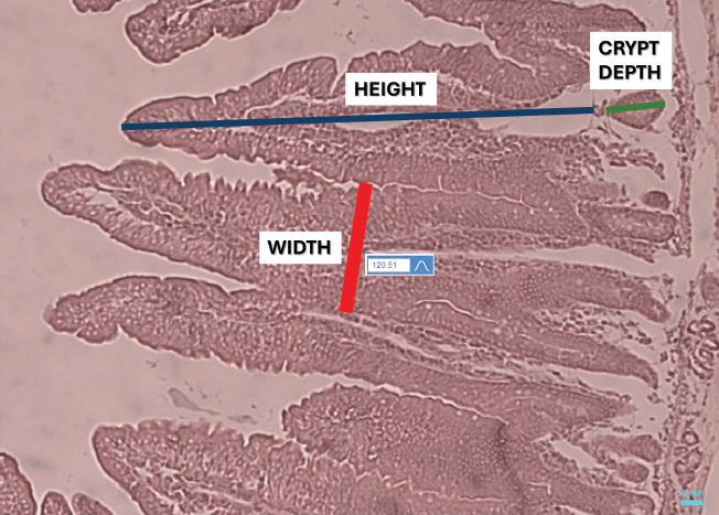 Fig. 1. Representative microphotograph (50×) demonstrating the intestinal morphology of Cavia porcellus guinea pigs. A transverse section of the jejunum stained with hematoxylin-eosin is shown, indicating intestinal villi HEIGHT (blue), considered from the base to the tip of the villus, villi WIDTH (red), measured in the in the middle area of each villus, and CRYPT of Lieberkühn DEPTH (green), located below the villi. These measurements were obtained in micrometers and were used for treatment comparison. Similar images were found in the rest of the evaluated fields of the other intestinal sections. Intestinal histometryVilla and crypt measurements are presented in Table 2. Intestinal villus heightSignificant differences were found in the height of each evaluated intestinal section (p < 0.05). In the duodenum, greater villus heights were detected at T1, T4, and T6, exceeding those at T2 and T3 (p < 0.05). Meanwhile, villi were taller in T5 than in T2 (p < 0.05). In the jejunum, villi in T4 were taller than those observed in T3, T5, and T6 (p < 0.05), and greater height was found in T2 than in T5 (p=0.02). Finally, in the ileum, villi in T4 were shorter than those in other treatments (p < 0.05), whereas in T2, the height was higher than in T5 (p < 0.05). Intestinal villus widthIn the experimental treatments, the measurement of villus width revealed differences in the duodenum (p < 0.05), jejunum (p < 0.05), and ileum (p < 0.05) compared with the control. Pairwise comparisons showed that the villi in the duodenum at T3 and T4 were wider than those at T1 (p < 0.05). Additionally, T4 had a greater width than T2 (p=0.01). Similarly, the intestinal villus width in the jejunum was greater in T3, T4, and the control group (T6) than in T1 (p < 0.05), and when comparing T6 and T2, the width was lower in the latter (p=0.03). Finally, in the ileum, the villus width in T1 was lower than in the other treatments (p < 0.05). Depth of Lieberkühn cryptsCrypt depth also showed significant differences in the three intestinal regions (p < 0.05). In the duodenum, T1 had the greatest depth compared with the other treatments (p < 0.05), and an elongation was found in T2 relative to T4 and T6 (p < 0.05). In the jejunum, probiotic application (T1–T4) resulted in greater crypt depth than in T5 (p < 0.05). Additionally, the control group showed less depth than T1 and T3 (p < 0.01). In the ileum, the crypts in T1 were the deepest (p < 0.05), while T4 and T6 had shallower depths than T3 (p < 0.05). Table 1. Effect of probiotic administration on WG and WFCR of guinea pig.