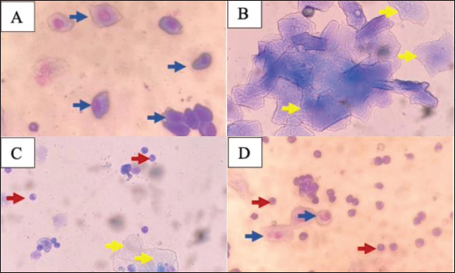 Fig. 1. Microscopic view of the estrous cycle in female rats (400×). A: Proestrus phase shows white blood cells, B: Estrus phase shows petiole cells with nuclei, C: Metestrus phase shows epithelial cells with nuclei and cornified cells, D: Diestrus phase shows white blood cells and cornified cells, ↑: epithelial cells with nucleus, ↑: cornified cells, ↑: leukocyte cells. Table 1. Average estrous cycle of female white rats (Rattus norvegicus).