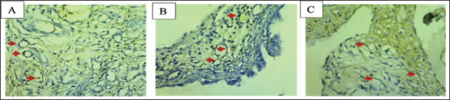 Fig. 2. Microscopic view of ER-β expression in ovarian cells using IHC (400×). A: Negative control, B: P1 dose (3.15 mg/kgBW of papaya leaf extract), C: P2 (4.72 mg/kgBW of papaya leaf extract), ↑: Expression of ER-β. Table 2. Average expression of ER-β in the ovaries.