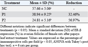 ABSTRACTBackground: Natural contraception is an affordable and accessible alternative to synthetic hormonal methods. One strategy for controlling overpopulation involves the use of plant-based agents that possess antifertility properties. Carica papaya (papaya) leaves have garnered scientific interest due to their rich content of bioactive compounds. Flavonoids, alkaloids, and saponins present in papaya leaves are known to influence reproductive physiology by modulating hormonal activity, disrupting follicular development, and altering uterine conditions. Aim: This study aimed to investigate the antifertility effects of papaya (Carica papaya L.) leaf extract by evaluating its influence on the length of the estrous cycle and the expression of estrogen receptor beta (ER-β) in the ovaries of female white rats (Rattus norvegicus). Methods: This study included six female albino rats (Rattus norvegicus) in the treatment group: negative control, P1 (3.15 mg/kgBW), and P2 (4.72 mg/kgBW) groups. Vaginal swab and Giemsa-stained epithelial histopathology were used to determine the estrous cycle duration. Immunohistochemistry was utilized to observe ovarian ER-β receptors. Results: The P2 dosage group demonstrated a 3-day increase in estrus cycle length and a 56.97% decrease in ovarian ER-β expression. This shows that the group can prolong the estrous cycle with a diestrus phase predominance and diminish ovarian ER-β expression, making it an anti-infertility drug. Conclusion: The P2 group best prolongs the estrous cycle of female white rats. The expression of ovarian ER-β decreases. Keywords: Antifertility, Extract of papaya leaf, ER-β, Vaginal Swab. IntroductionNatural contraception plays a significant role in reducing overpopulation due to its affordability and ease of use (Aritonang, 2019). Overpopulation of animal species, often due to the lack of natural predators or human intervention, can lead to habitat destruction, food source depletion, and negative impacts on biodiversity and ecosystem balance. In the context of animal population control, particularly among dogs and cats, veterinarians frequently employ both contraception and sterilization techniques. While sterilization such, as spaying and neutering, is effective, it is generally more expensive and invasive than natural contraceptive methods. According to Wang et al. (2021), natural contraception is a cost-effective alternative that can be more widely implemented, especially in communities with limited access to veterinary services or funding for surgical procedures. Tropical Indonesia is home to a rich diversity of flora and fauna, including a wide variety of medicinal plants with significant exhibiting antifertility effects, indicating a potential impact on reproductive function that warrants further investigation. Many indigenous herbs have been identified for their potential use in natural contraception. One such plant is papaya (Carica papaya), which is widely available and traditionally used for both nutritional and medicinal purposes. Various parts of the papaya plant, including its leaves, seeds, and fruit, are known to possess bioactive compounds with antifertility properties. According to Aritonang (2019), papaya leaves, in particular, contain substances that can be developed into natural contraceptive agents, offering a plant-based alternative to synthetic methods. These agents work by disrupting key physiological mechanisms in both the male and female reproductive systems, thereby inhibiting fertility. Post-copulation antifertility methods, in particular, act after mating to prevent fertilization from occurring. By lowering the chances of successful fertilization, these agents offer an effective, non-invasive approach to population control, especially in areas with limited access to surgical sterilization methods (Santana et al., 2019). Flavonoids, alkaloids, and saponins found in papaya leaves act as phytoestrogens by binding to estrogen receptors, which can mimic or modulate endogenous estrogen activity. This interaction may contribute to elevated circulating estrogen levels. Elevated estrogen exerts negative feedback on the hypothalamus, inhibiting the secretion of gonadotropin-releasing hormone (GnRH). As GnRH secretion decreases, the anterior pituitary reduces its release of luteinizing hormone (LH) and follicle-stimulating hormone (FSH), both of which are essential for follicular development. Suppressed FSH impairs follicle maturation, which may delay the onset of estrus. In addition, papaya steroidal alkaloids may influence gonadotropin balance, potentially altering ovarian structures such as follicle size, corpus luteum formation, and theca cell layer thickness and decreasing with steroid alkaloid compounds. Alkaloid compounds prevent ovulation and embryonic resorption (Dave and Trivedi, 2019). Saponin, a steroid derivative known for its antifertility properties, is one of the promising bioactive compounds found in various medicinal plants. Saponins can disrupt the activity of nerve cells in the hypothalamus, the part of the brain that produces the hormone GnRH. GnRH is a key hormone that regulates reproduction. Disruption of hypothalamic and pituitary activity disrupts the negative feedback loop on GnRH secretion. This hormonal imbalance affects the downstream release of LH and FSH, both of which are essential for normal reproductive function In addition to hormonal interference, saponins exert cytotoxic effects on reproductive cells. These compounds can compromise cell membrane integrity, leading to leakage and eventual cell lysis. As a result, ovarian follicle development may be significantly impaired, contributing to reduced fertility. Therefore, the presence of saponins in certain plants, such as papaya leaves, supports their potential application as natural contraceptive agents (Aritonang, 2019). Considering these factors, the potential of papaya leaf extract as a natural antifertility agent has become in