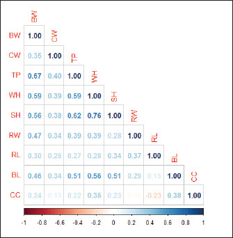 Pearson’s correlation coefficient was used to determine the degree of association between the biometric measurements. All coefficients were significant (p < 0.05), except for RW with CC. Figure 1 shows high positive correlation coefficients between SH and WH (0.76), and TP and BW (0.67). Meanwhile, moderate positive correlation (<0.40) coefficients were CW and BW, TP and CW, WH and BW, WH and CW, WH and TP, SH and BW, SH and CW, and SH and TP; RW and BW, RW and TP, RW and WH; BL and BW, BL and CW, BL and TP, BL and WH, and BL and SH; the other correlation coefficients were low positive, with the exception of RL, which was low negative.