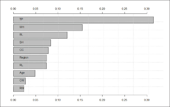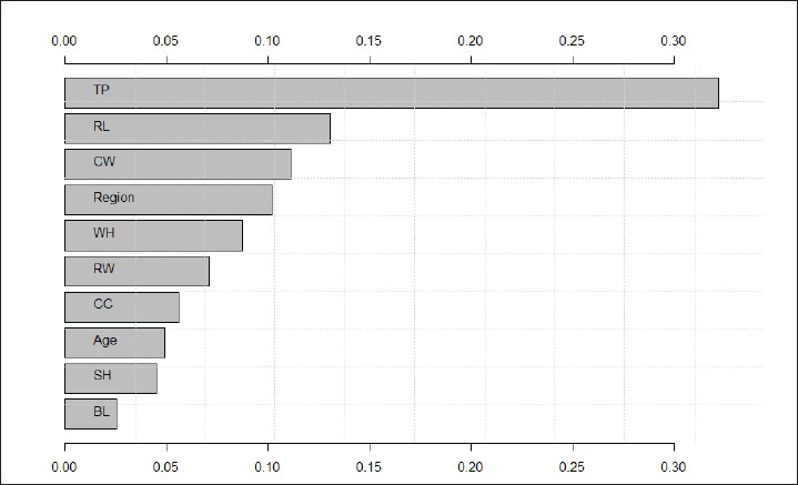 Sensitivity analysis was used to estimate the model’s virtual significance for the BW explanatory variables (Fig. 4). The most significant variables were TP, WH, and region importance obtained after the sensitivity analysis. The explanatory variables that were less important were BL and age.