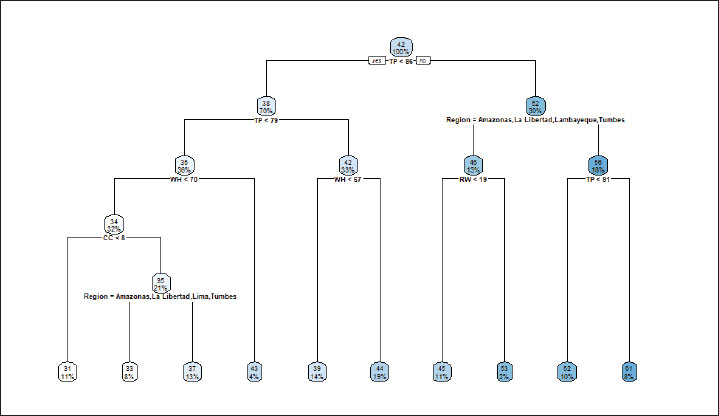 Using the RFR algorithm, the TP and region showed greater relative importance for the choice of model; the second group had WH and SH with greater relative importance. Conversely, CW and age were not important for RFR modeling (Fig. 2). Figure 3 shows the tree diagram using the CART algorithm, in which the 42 kg BW is the root node. In the case of TP, an initial depth <86 cm determined that the BW for Creole goats was 38 kg (70%). On the right side of the tree, the initial depth in of TP > 86 cm, the tree was divided into 2 parts. If TP was < 79 cm, the BW of 35 kg (36%) was determined, and the tree was divided according to the WH < 67 cm, the BW of 42 kg (33%) was determined. The mean BW was 52 kg (30%) if the TP was 86 cm in the first division, if region=Amazonas, La Libertad, Lambayeque, and Tumbes, BW=46 kg (13%); other regions, the mean BW was 56 kg (18%).