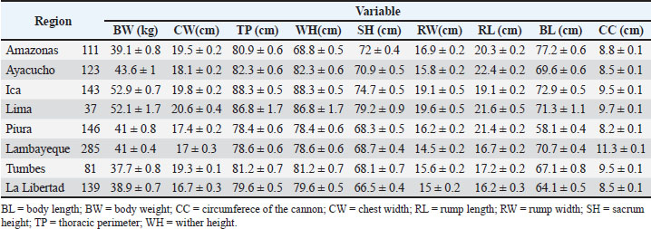 Biometric information taken from BW, CW, TP, WH, SH, RW, RL, BL, and CC by mean and SD, indicating that, according to the region, to small goats were kept (Table 2). The Ica goats were medium-sized with a body weight of 52.9 ± 0.7 kg, frequently grazed in puna and the steppe mountains; while the Tumbes small goats with a body weight of 37.7 ± 0.8 kg, grazed in equatorial dry forest.