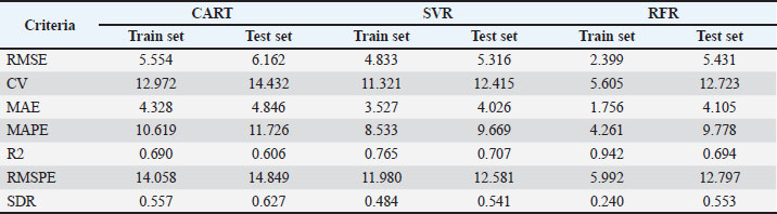 Table 3. Goodness-of-fit criteria for the CART, SVR, and RF algorithms used for the live simulation weight prediction.