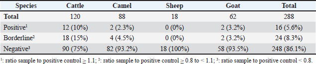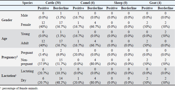 Ethical approvalThis study was conducted in accordance with the principles of the Declaration of Helsinki. The Ethics Committee of King Faisal University, Saudi Arabia, approved this study (KFU-REC-2025-MAR- ETHICS3208). ResultsA total of 288 serum samples were collected from 120 cattle, 88 camels, 18 sheep, and 62 goats kept on different farms in the Al-Ahsa Region in the Eastern Province of Saudi Arabia. The samples were evaluated for the presence of antibodies against the gram-negative bacterium H. pylori. For all species, 16 samples were positive for H. pylori with an overall prevalence of 5.6%, 24 samples (8.3%) were considered borderline, and 248 samples (86.1%) were negative (Table 2). The highest seroprevalence was found within the cattle population, with 12 positive and 18 borderline samples corresponding to 10% seropositivity and 15% borderline positivity, respectively (Table 2). All the positive and borderline cattle were female except for one male. All positive and borderline cattle were adult animals, except for one young animal. The borderline female animals included three lactating and 14 non-lactating cows, and two pregnant and 15 non-pregnant cows. The seropositive female animals included six lactating and six non-lactating cows and one pregnant and 11 non-pregnant cows (Table 3). Among the tested goat samples, two samples were positive for H. pylori antibodies (3.2%) and two were borderline positive (3.2%). All positive goats were female animals of the Ardi breed, including two positive adults and two borderline young goats. All tested sheep samples were negative for H. pylori antibodies. Within the camel population, two animals were found positive (one of the Mogateer and one of the Mojaheem breed), and four animals (two of the Mojaheem and two of the Omani breed) were found borderline for H. pylori antibodies, representing a seropositivity of 2.2% and borderline positivity of 4.5%, respectively. The positive animals (positive and borderline) included five females (all non-lactating and one pregnant) and one male camel. All the camels were adult animals, except for one young animal. DiscussionThe gram-negative spiral bacterium H. pylori is the causative agent of stomach ulcers in humans (Shaaban et al., 2023). Although the exact route of infection remains unknown, transmission through the oral-oral or fecal-oral routes has been proposed (Duan et al., 2023; Costa et al., 2024). The zoonotic potential of H. pylori has been reported in different studies (Rahimi and Kheirabadi, 2012; Mladenova-Hristova et al., 2017; Guessoum et al., 2018). Although a high prevalence of H. pylori was reported in humans from Saudi Arabia, studies on the role of local animals in disease transmission to humans are still limited. Therefore, the present study was conducted to test the presence of anti-H. pylori antibodies in serum samples collected from different animal species in the Eastern Region of Saudi Arabia. The assumption of a zoonotic potential of H. pylori first came from epidemiological studies reporting the higher prevalence of H. pylori infection in professionals involved in animal handling or dealing with animal products, such as abattoir and meat professionals (Morris et al., 1986; Vaira et al., 1988). Subsequently, several studies were conducted in different countries and geographical areas of the world on the presence of H. pylori in animals with different prevalence results related to animal species and other factors (Dore et al., 2001; Turutoglu and Mudul, 2002; Rahimi and Kheirabadi, 2012; Mladenova-Hristova et al., 2017; Elhariri et al.et al., 2018; Guessoum et al.et al., 2018; ). The results of the present study are in line with those of previous studies reporting a higher prevalence of H. pylori in cows than in other ruminants (Elhariri et al., 2018). Similarly, Talaei et al. (2015) reported a higher prevalence of H. pylori in cattle (16%) than in sheep (13.7%), goats (4.7%), and camel (13.3%) (Talaei et al., 2015). Table 2. Prevalence of H. pylori antibodies in serum samples from cattle, camels, sheep, and goats from the Al-Ahsa Region in the Eastern Province of Saudi Arabia.