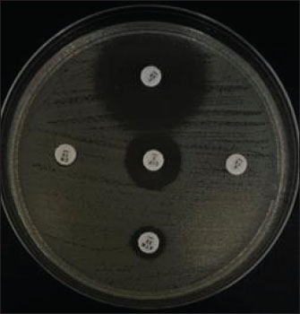 Fig. 3. Double disc synergy test results for selected E. coli isolates from duck cloacal swabs collected in traditional markets in Surabaya, Indonesia. Table 4. Results of antibiotic sensitivity test, MDR, and ESBL.