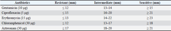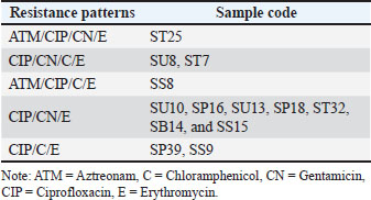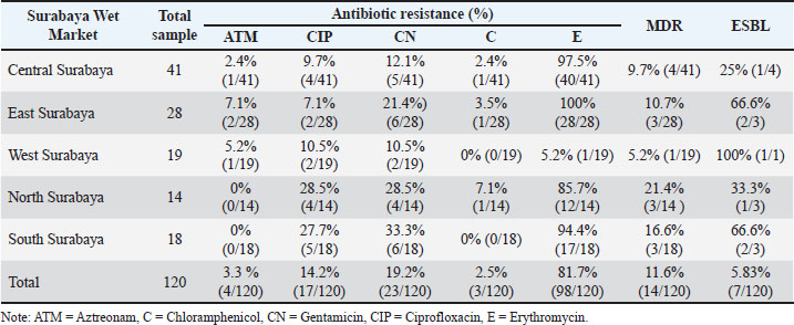 The results of the resistance test in this study indicated that 14/120 (11.6%) patients experienced MDR. The resistance assay involved five antibiotics: aztreonam, chloramphenicol, gentamicin, ciprofloxacin, and erythromycin. The resistance assay was evaluated using a broad-spectrum class of antibiotics (Widodo et al., 2023a). Antibiotic resistance to three antibiotic classes indicates the occurrence of MDR. Prayudi et al. (2023) found that more than three to four (31.25%) varieties of antibiotics from traditional markets in Surabaya were resistant. Previous studies demonstrated that the incidence of MDR in ducks was 100% for five different antibiotic classes (Yassin et al., 2017). This demonstrates how the issue of antibiotic resistance significantly affects public health because of excrement in the marketplace (Widodo et al., 2024). Antibiotic resistance in ducks in West Bengal, India, includes gentamicin 4/47 (8.5%), chloramphenicol 2.1% 1/47 (2.1%), and ciprofloxacin 15/47 (31.91%) (Banerjee and Acharyya, 2021).