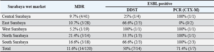 The highest antibiotic resistance to erythromycin was 81.7%. The careless use of antibiotics by the poultry industry can increase the prevalence of MDR and antibiotic resistance in E. coli bacteria (Khairullah et al., 2024). Erythromycin is a macrolide antibiotic often used in the poultry industry (Wibisono et al., 2020b). The high resistance rate to erythromycin observed in our study reflects the intrinsic resistance of E. coli due to the impermeable outer membrane and active efflux mechanisms, rather than acquired resistance from antibiotic misuse (Yanestria et al., 2022). Ciprofloxacin is a broad-spectrum antibiotic frequently used in the chicken industry to treat E. coli infections in the respiratory, digestive, and urinary tracts (Ivanova et al., 2017). The results of this study were 14.2%, which was lower than that in Bangladesh (69%; Singh et al., 2012), Northern Nigeria (85%; Akanbi et al., 2022), and Egypt (26.32%; Abd El-Samie et al., 2019). These differences may reflect variations in antimicrobial usage policies, veterinary oversight, and poultry production systems. For instance, the higher prevalence of antibiotics in Bangladesh and Nigeria could be associated with the more frequent and less regulated use of antibiotics in backyard or small-scale poultry farms, as well as the limited implementation of biosecurity measures. In contrast, the relatively lower prevalence observed in the present study may be influenced by differences in farming practices, local market supply chains, and recent efforts to improve AMS in certain regions of Indonesia. Table 5. Occurrence rate of E. coli ESBL infection in MDR isolates.