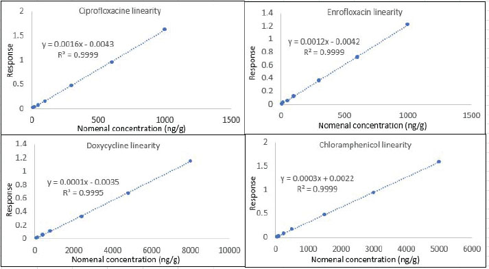 Calibration curveThe repeated analysis of CC for each of CI, EN, DOX, and CAM through validation days has exhibited a reproducible slope with a good regression value, as shown in Table 4 for the parameters summary of six replicate analyses for CC spiked in poultry blank meat, where all calibrators were within the acceptance criteria. The linear curve data were best-fit to a straight line with a weighting factor of 1/x regression function, and it was used to calculate the concentrations of all samples throughout the batch. Figure 4 shows how the relationship between the established dynamic range and the corresponding response for each analyte is perfect.
