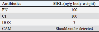 DiscussionAll the validation results for each analyte met the acceptable criteria of the guidelines. The method was applied to unfrozen meat samples that were freshly collected. Most of the randomly collected poultry and red meat samples contained CI residues. A few samples contained EN and DOX residues, whereas no CAM was detected in any of the collected samples. It was found that 100% of the poultry samples were contaminated with CI, 15% with EN, 15% with DOX, and 0% with CAM. Among the red meat samples, 80% were contaminated with CI, 48% with EN, 20% with DOX, and none with CAM. For the fish samples, 33% were contaminated with EN, while 0% were contaminated with CI, DOX, or CAM. Negative values in Table 6 indicate that the analyte was not detected, and no measurable peak corresponding to the analyte was observed at its retention time. These findings are consistent with those of previous studies, showing the common use of fluoroquinolones and tetracyclines in livestock production. The complete absence of CAM, a drug banned in food animals under EU law, may reflect some degree of regulatory enforcement. Compared with previous studies, including our earlier work on milk matrices (Muti et al., 2021), this study expands the application of HPLC-UV to solid meat tissues using a single, rapid, and cost-effective method. The novelty of the study lies in the simultaneous quantification of four antibiotics in three different meat matrices, which is not commonly addressed in a single UV-based assay. The method’s simplicity and adaptability make it suitable for routine use in laboratories with limited access to advanced equipment, such as liquid chromatography-tandem mass spectrometry (LC-MS/MS). This highlights the importance of monitoring veterinary drug residues in food products for public health and supports the need for tighter regulation and routine screening, especially in developing countries. ConclusionThis study clearly showed that poultry, red meat, and fish were not completely free from antibiotic residue. Some residue levels were above the MRL recommended limit according to the European Union EC. The developed method for the simultaneous determination of CI, EN, DOX, and CAM in different meat matrices using HPLC-UV was successfully validated following the European guidelines and then applied to investigate the residues of targeted antibiotics in poultry, red meat, and fish products. Some antibiotic residues were detected at higher concentrations than the accepted MRLs. This study has been conducted to increase the awareness and the risk of antibiotic residues on the health of people and will encourage the competent authorities to regulate and take the necessary measures to provide healthy meat free from antibiotic residues for humans. AcknowledgmentsThe authors acknowledge the Deanship of Scientific Research at Al-Ahliyya Amman University, Amman, Jordan, for their financial support and the support of the Jordan Center for Pharmaceutical Research (JCPR) for their facility. Conflict of interestThe authors declare no conflict of interest. FundingNo external funding was provided. Authors’ contributionsAll authors contributed to this study and contributed either by experimental application or manuscript writing and revision. Data availabilityAll data supporting this study’s findings are available upon reasonable request. ReferencesArslanbas, E. 2018. Determination of antibiotic residues in meat samples using high-performance liquid chromatography. Erciyes Univ. Vet. Fak. Derg. 13, 247–252. Babapour, A., Azami, L. and Fartashmehr, J. 2012. Overview of antibiotic residues in Iranian beef and mutton. World Appl. Sci. J. 19, 1495–1500. Baiphethi, M.N. and Jacobs, P.T. 2009. Subsistence farming’s contribution to food security in South Africa. Agrekon 48, 459–482. Barton, M. D. 2000. Antibiotic use in animal feed and its impact on human health. Nutr. Res. Rev. 13, 279–299. CAC. 2018. The codex alimentarius commission maximum residue limits for veterinary drugs in foods. Rome, Italy: Food and Agriculture Organization/WHO, Vol. 2. Chan, C.L., Wai, H.K.F., Wu, P., Lai, S.W., Chan, O.S.K. and Tun, H.M. 2022. Prevalence of antibiotic residues in meat: a systematic review. Antibiotics 11, 845. Chanda, R.R., Fincham, R.J. and Venter, P. 2014. Veterinary drug residues in animal products: health implications. Crit. Rev. Food Sci. Nutr. 54, 488–494. Elsayed, A.S., Abusham, A., Al-Touby, S.S.J., Al Rajhi, W.K.H. and Hossain, M.A. 2023. Antibiotic residue detection in meat using LC-MS. Food Anal. Methods 16, 1618–1626. European Commission. 2010. Commission Regulation (EU) No 37/2010 on pharmacologically active substances and their classification. Union L15, 1–72. European Medicines Agency (EMA). 2012. Framework for a correlation table (VNeeS:CTD) for ASMFs/Part 2 in CTD format for dossiers for veterinary medicinal products. Reference No. EMA/115282/2012. European Union Food and Veterinary Office. 2015. Final report of an audit on the control of residues. European Union Food Vet. Off. 1, 1–16. European Union. 2009. Regulation (EC) No 470/2009 of the European Parliament and of the Council. Off. J. Eur. Union L 152, 11–22. Government of Canada. 2015. Health Canada veterinary drugs directorate. Summary report. Drugs Direct 1, 1–101. Granados-Chinchilla, F. and Rodríguez, C. 2017. Tetracyclines in food and feedingstuffs: from regulation to analytical methods, bacterial resistance, and environmental and health implications. J Anal Methods Chem. 2017, 1315497. Kamouh, A., Al-Kaf, A.G., Al-Kaf, M.A., Baqir, S.J., Al-Sharafi, W.A. and Al-Mansoury, R.M. 2024. Detection of antibiotic residues in broiler meat marketed in Dhamar city, Yemen, and the effect of boiling on residue levels. Open Vet. J. 14, 438–448. Landers, T.F., Cohen, B., Wittum, T.E. and Larson, E.L. 2012. A review of antibiotic use in food animals: perspective, policy, and potential. Public Health Rep®. 127(4), 4–22. La