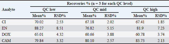 Fig. 3. Representative chromatogram of the LLOQ sample spiked in poultry meat. RecoveryThe extraction method was sufficiently efficient to successfully quantify the targeted analytes from poultry meat tissues. Table 3 summarizes the investigated recoveries for CI, EN, DOX, and CAM at low, mid, and high QCs. Table 3. Extraction recoveries and relative standard deviation (RSD) values for CI, EN, DOX, and CAM.