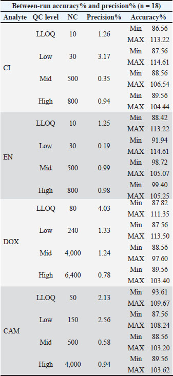 Sensitivity, accuracy, and precisionSensitivity, accuracy, and precision validation were investigated within- and between-runs for CI, EN, DOX, and CAM in poultry meat. All measurements obtained from the LLOQ and low mid and high QCs were within the acceptance criteria. Table 5 summarizes the mean measurements, including RDS% values. The measured accuracy and precision values for LLOQ represent the sensitivity of the applied method, where LLOQ is considered the QC level. Table 5. Summary of between-run accuracy and precision measurements including nominal concentration (NC) for each QC level of CI, EN, DOX, and CAM in poultry matrix.