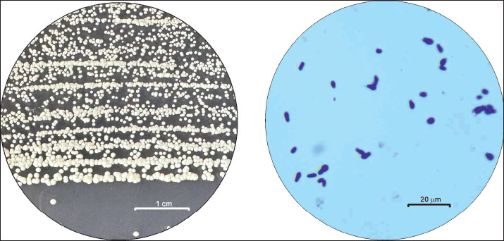 Fig. 1. Left: macroscopic appearance of round, smooth, white to creamy, convex M. pachydermatis colonies on SDA after 72 h of incubation (bar=1 сm); right: Gram-stained smear showing the specific peanut shape of the yeast pathogen (bar=20 μm). Statistical analysisThe reported variables included the year of isolation, sampling site, presence or absence of bacterial coinfection, and microbial pathogen genus. The differences in the prevalence of M. pachydermatis according to the sampling site were assessed using the chi-square test and test of independent proportions. The chi-square test for trend was used to evaluate year-wise changes during the study period. p-values < 0.05 were considered statistically significant (MedCalc v.15.8). Ethical approvalPatients were examined after signing a standard informed consent form by the owner containing a clause authorizing the use of signalment and/or clinical data gathered during the procedures by the hospital’s academic staff for research purposes. The Manager of the University Veterinary Hospital of Trakia University allowed access to patient data, with full anonymity of the owner’s name, address, and phone number. ResultsThe microbiological examination of swab samples resulted in 201 unique Malassezia pachydermatis identifications, 189 from otitis and 12 from skin lesions, based on the macroscopic and microscopic appearance of colonies and cells and the ability of isolates to grow on a medium without lipid supplementation. For the 5-year period of study, the prevalence of yeasts in dogs with ear infections varied between 50.0% (in 2020) and 67.3% (in 2021), with an overall isolation rate for 2019–2023 of 60.19% (95% confidence interval 51.92%–69.41%) (Fig. 2). Compared with the total number of swab samples from skin lesions, the involvement of M. pachydermatis was significantly lower than that from otitis samples (p < 0.001). For the study period, the overall isolation rate was 4.11% (95% confidence interval 2.12%–7.18%). The distribution of skin yeast isolates over the years was markedly uneven: 30.8% in 2020 versus the absence of yeast isolates in 2022.
