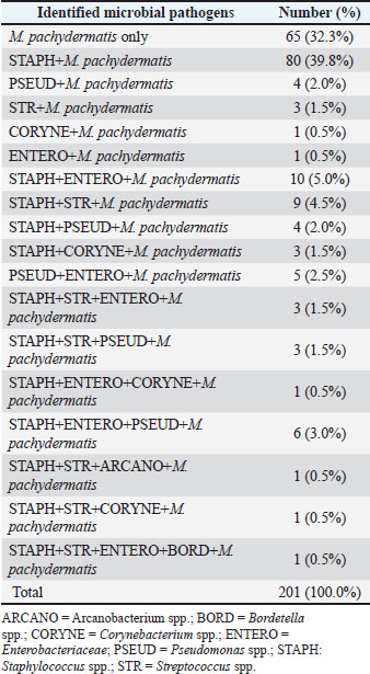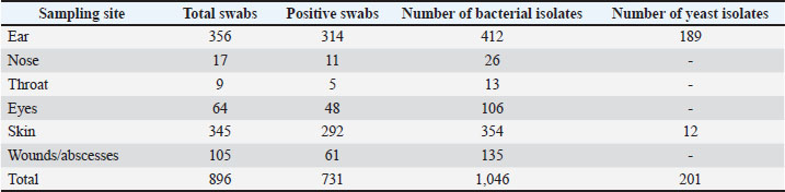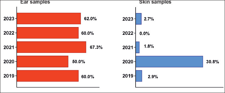 AbstractBackground: Malassezia yeasts are part of the resident microbiota of canine skin and ear canal. The compromised immunity of animals, changes in environmental factors, and antibacterial treatment often result in their proliferation and subsequent complications. Aim: This single-center retrospective study was designed to investigate the prevalence of Malassezia spp. yeasts as agents of mono- and co-infections in dogs with clinical signs of inflammation referred to the University Veterinary Hospital, Stara Zagora, in 2019–2023. Methods: Swab samples of ear, nasal, conjunctival, throat discharges, wound, abscess, and fistula discharges, and skin lesion fluid were collected from dogs with clinical inflammation using sterile cotton applicators, immediately transferred to Stuart transport medium, and inoculated on different culture media within 24 hours. The presence of microorganisms was reported based on isolation in pure culture or as the predominant isolate in a mixed culture. The yeasts were identified by the specific growth morphology of colonies and cell morphology. Data analysis included the year of isolation, sampling site, and microbial pathogen genus. The differences in the prevalence of yeasts according to the sampling site were assessed using the chi-square test and test of independent proportions. Results: During 2019–2023, the microbiological examination of 896 swab samples from dogs with clinical signs of inflammation referred to the University Veterinary Hospital, Stara Zagora, resulted in 201 unique Malassezia pachydermatis identifications, including 189 from otitis and 12 from skin lesions. The 5-year prevalence of yeasts in dogs with ear infections was 60.19% (95% confidence interval 51.92%–69.41%) and in dogs with skin infections was 4.11% (95% confidence interval 2.12%–7.18%). Malassezia pachydermatis was the only infectious agent in 32.3% of dogs with otitis. In 39.8% of cases, it was associated only with staphylococci, whereas polymicrobial infections were less frequently registered. In dogs with skin lesions, M. pachydermatis was always isolated together with a bacterial pathogen, most often staphylococci. Conclusion: The relatively constant presence of M. pachydermatis in canine clinical samples from otitis and skin infections implies that targeted testing for yeasts should not be omitted with regard to more accurate diagnosis of the etiological agents and successful treatment outcome. Keywords: Yeasts, Otitis, Skin lesions, Canine clinical samples. IntroductionMalassezia spp. are lipid-dependent yeasts belonging to the family Malasseziaceae, order Malasseziales within the phylum Basidiomycota (Laniri, 2022). Currently, 18 species have been identified based on molecular analyses and physiological peculiarities (Díaz et al., 2024). Malassesia spp. require lipid-supplemented culture media to improve the isolation (Cabañes, 2014), with the exception of the lipophilic Malassezia pachydermatis (M. pachydermatis) that grows well on Sabouraud Dextrose Agar (SDA) due to its ability to utilize lipid fractions from the SDA peptone component (Ilahi et al., 2017; Hobi et al., 2022). Malassezia yeasts were first isolated from the skin of humans, followed by other warm-blooded vertebrates, and later from a range of ecological niches, establishing them as one of the most widespread and adaptable fungal genera (Richards et al., 2012; Theelen et al., 2018; Hobi et al., 2022). Malassezia species are among the most common agents colonizing the oily areas of the skin and mucosal sites of healthy dogs and cats based on cultural characteristics or molecular methods (Brito et al., 2009; Bond et al., 2020; Hobi et al., 2022). Numerous studies have identified M. pachydermatis as the dominant species in the cutaneous mycobiota of dogs, whereas other species are also present in the cutaneous mycobiota of cats (Eidi et al., 2011; Bond et al., 2020; Guillot and Bond, 2020; Meason-Smith et al., 2020). Mycelial fungi and yeasts cause dermatomycosis in companion animals. Malassezia otitis and dermatitis are the most relevant superficial mycoses in dogs and cats. The most common fungal isolates from skin lesions are M. pachydermatis (29.14%), Candida spp. (27.07%), and dermatophytes (23.5%), while M. pachydermatis accounts for 80% of fungal otitis externa isolates (Dworecka-Kaszak et al., 2020; Daniel, 2022). The non-lipid-dependent species M. pachydermatis is frequently associated with canine ceruminous otitis externa and seborrheic dermatitis. The compromised immunity of animals, changes in environmental factors, and antibacterial treatment often result in yeast proliferation and subsequent complications. Folds, underlying hypersensitivity, and endocrinopathies favour skin disease. The diagnosis is based on the detection of yeast in ear and skin lesions by cytology and culture (Moraru et al., 2019; Guillot and Bond, 2020). The public health importance of Malassezia species increases due to their ability to colonize pets; therefore, their role as zoonotic pathogens should not be underestimated (Chupryna et al., 2024). In humans, these yeasts may be involved in skin diseases, such as atopic dermatitis, folliculitis, psoriasis, and Pityriasis versicolor. Malassezia spp. have increasingly been reported in severe systemic infections, especially among immunocompromised patients receiving parenteral nutrition and premature neonates (Rhimi et al., 2020; Abdillah and Ranque, 2021). A report of a neonatal fungemia outbreak caused by M. pachydermatis showed that the causative strain was isolated from dogs owned by health care workers in the involved nursery unit (Chang et al., 1998). In a later study (Morris et al., 2005), the carriage of M. pachydermatis in healthy and diseased dogs with allergic dermatitis or otitis externa was compared to that of healthy human owners, and M. pachydermatis DNA was identified on the palms of over 90% of pet owners, regardless of the disease state of their do