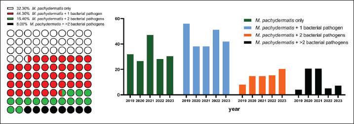 Fig. 3. Left: Percentage of M. pachydermatis monoinfection and co-infection patterns for the 2019–2023; right: year-wise distribution of M. pachydermatis mono- and co-infections. Table 2 shows the specific combinations of M. pachydermatis with one or more different groups of bacterial isolates. For co-infections with a single bacterial pathogen, the combination with Staphylococcus spp. was the most frequent, accounting for 90% of all cases. There was no significant difference between the prevalence rates of the five established combinations of M. pachydermatis + two bacterial pathogens. In five patients, M. pachydermatis was encountered together with Pseudomonas spp. and Enterobacteriaceae. Staphylococci were present in the four other combinations. Table 2. Malassezia pachydermatis isolates from otitis and skin lesions (n=201) from 2019 to 2023 and their association with bacterial pathogens.