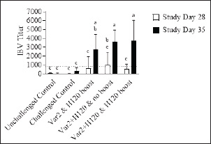 Fig. 1. IBV antibody titers. On D0, D14, D28, and D35 ten birds from each group were bled. Serum samples were analyzed with a commercial ELISA kit. Samples from D0 and D14 were negative and were excluded for clarity. Bars represent the mean ± SD (n=10). The dotted line represents the 833 minimum titer for a sample to be considered positive. Two-way ANOVA followed by Šídák multiple comparisons test. Bars not connected by the same letter are significantly different (p < 0.05).