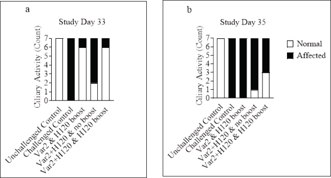 Fig. 5. Ciliary activity. On D33 (a) and D35 (b), seven birds from each group were euthanized and 10 tracheal explant sections were scored for ciliostasis For a given tracheal section, ciliary activity was considered normal when at least 50% of the internal ring showed vigorous ciliary movement, e.g., when the ring was given a score ≤ 2. A bird was considered normal when ≥9 out of 10 rings showed normal ciliary activity.